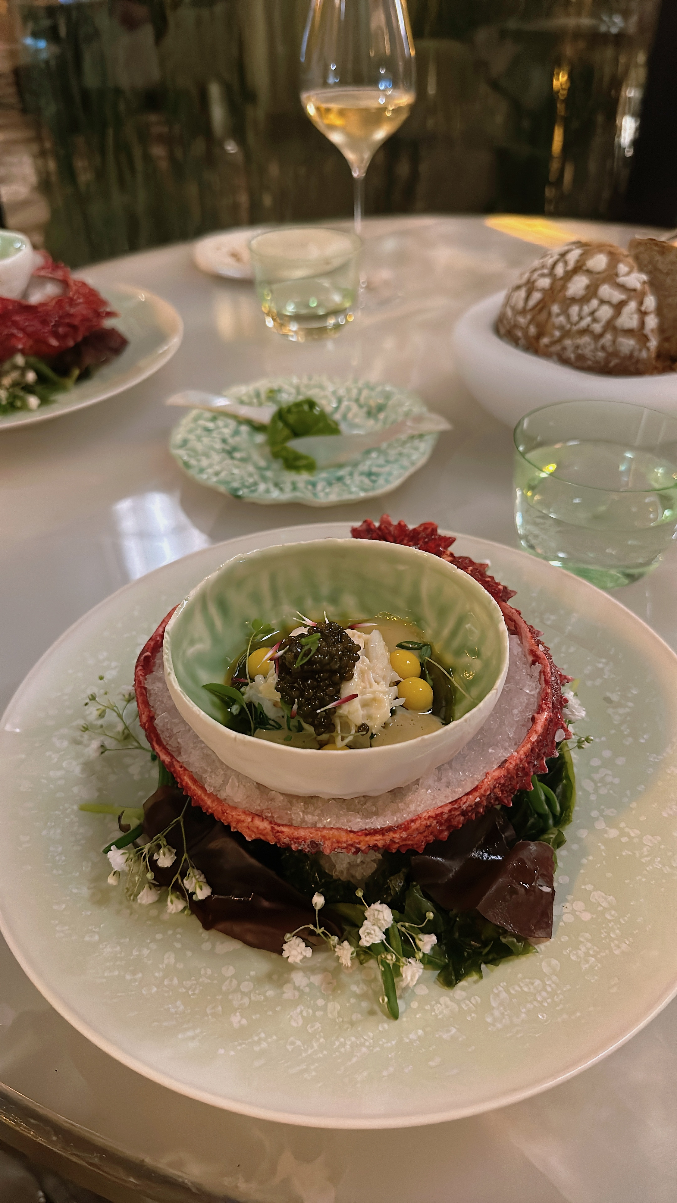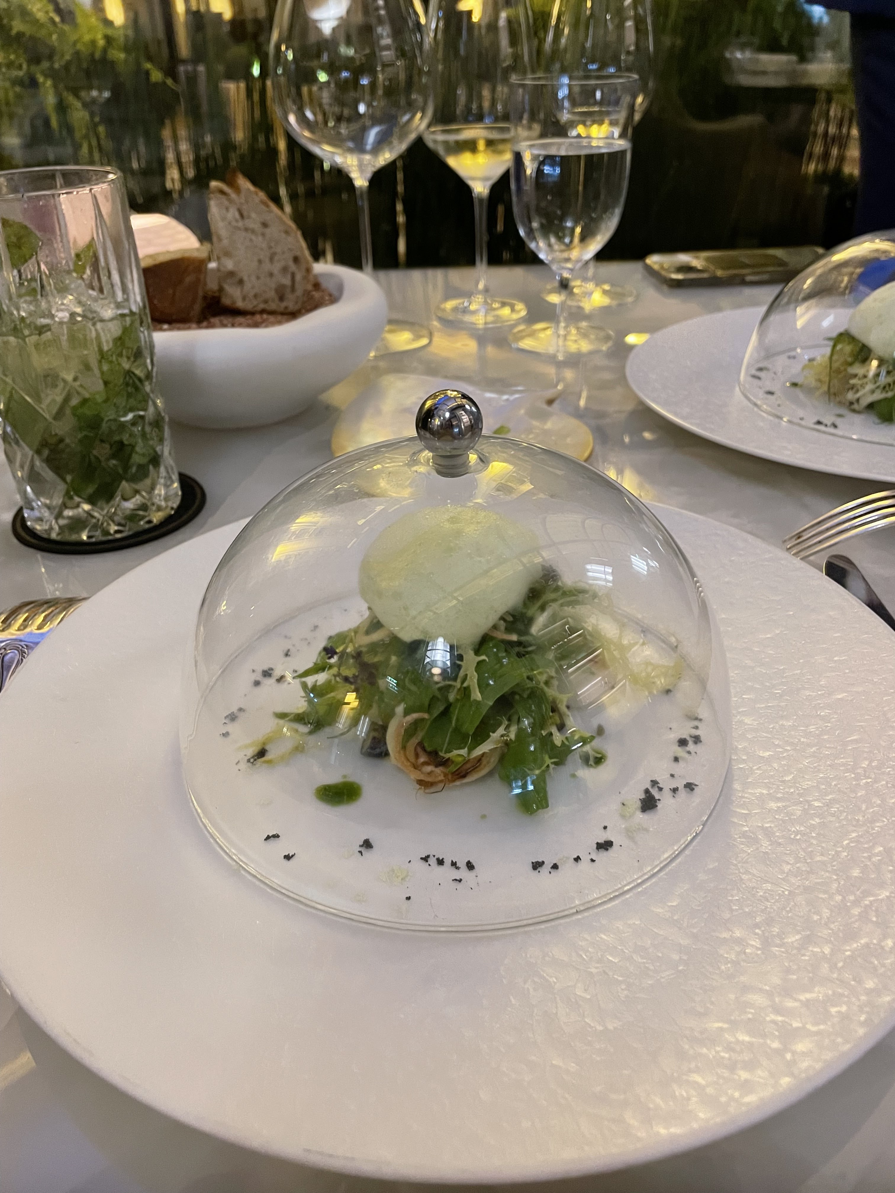 Très beau cadre, intimiste. Installé face à la cour intérieure sous la verrière j'étais dans une bulle de douceur hors du temps et du stress de l'avenue à côté. Les cocktails sans alcool, au nombre de deux dans la liste proposée étaient de réelles surprises ! Un cocktail aux petits poids vous auriez testé vous ? Quelle finesse ! Les plats étaient tous plus beaux et goûteux les uns que les autres. J'ai aimé l'ambiance iodée et verte tout au long des plats. Malgré un menu conséquent en terme de nombre de plats, je suis reparti sans faim et sans sensation de lourdeur non plus. J'ai aimé la qualité d'écoute et de service, la personnalisation des plats ( pas de produits cru pour madame, pas d'alcool pour monsieur), le pain (MOF) et le beurre aux algues. J'ai moins aimé la note, encore que, comparé à d'autres restaurants de ce type, celui ci était 100eur moins cher par personne. Très beau moment !