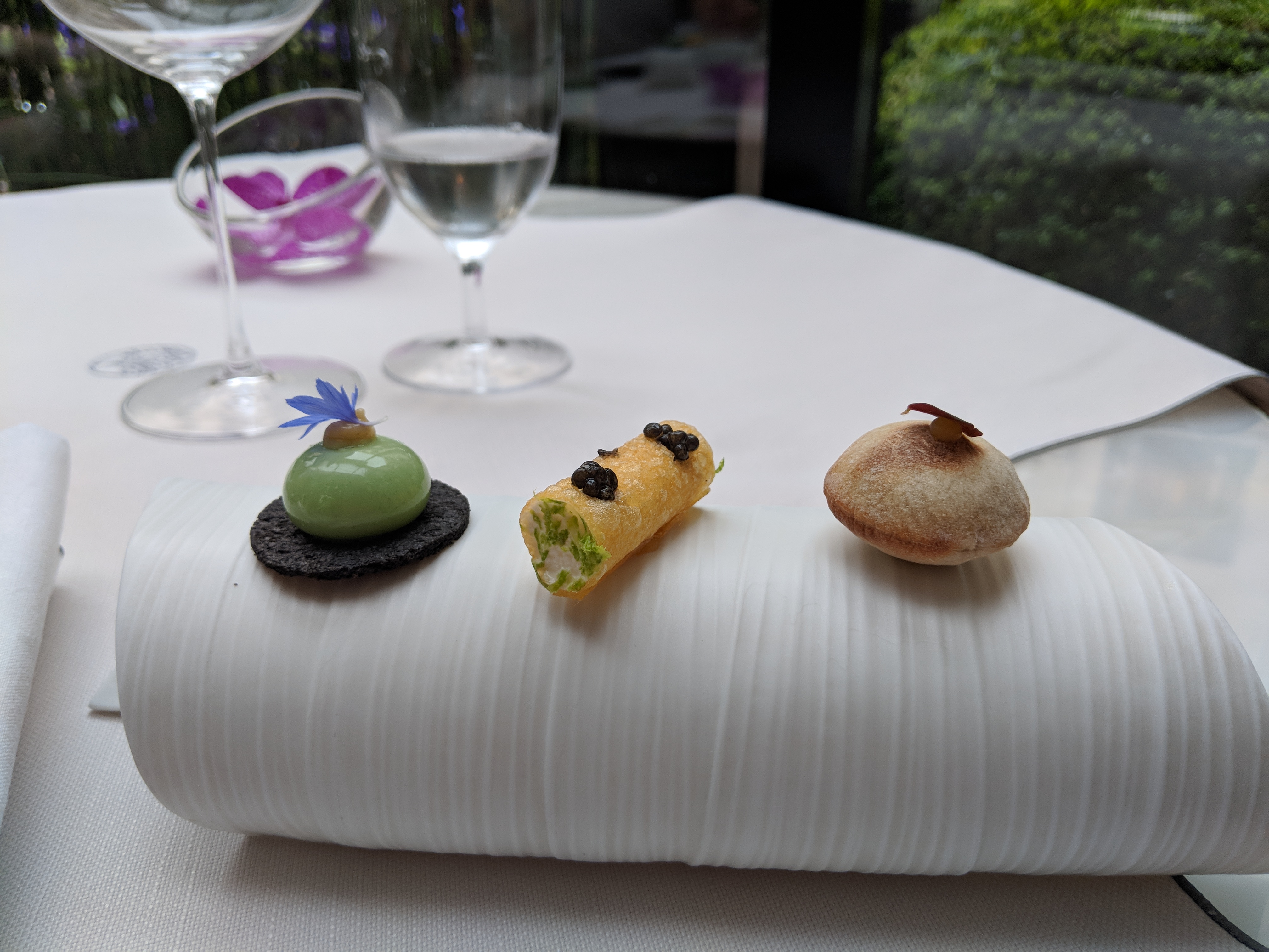 C'est mon premier restaurant Michelin. Il est situé dans l'hôtel 4 saisons. Nous avons tous deux pris le menu du déjeuner avec une combinaison différente. Toute la nourriture qui venait était si belle à mes yeux et brillante dans ma bouche. Nous n'avons pas pu résister à l'envie de prendre le désert de fleurs dont parlait le serveur et de le vendre si bien. C'est un peu méchant de dire ça, mais le pain était époustouflant. Certainement un très bon rapport qualité-prix (75 euros chacun pour le menu sans dessert) pour l'expérience ! Essayez de réserver un mois à l'avance si vous souhaitez avoir accès au menu du déjeuner :) Les serveurs étaient incroyables et de premier ordre. Ambiance vraiment paisible avec vue sur le jardin. Je le recommande vivement