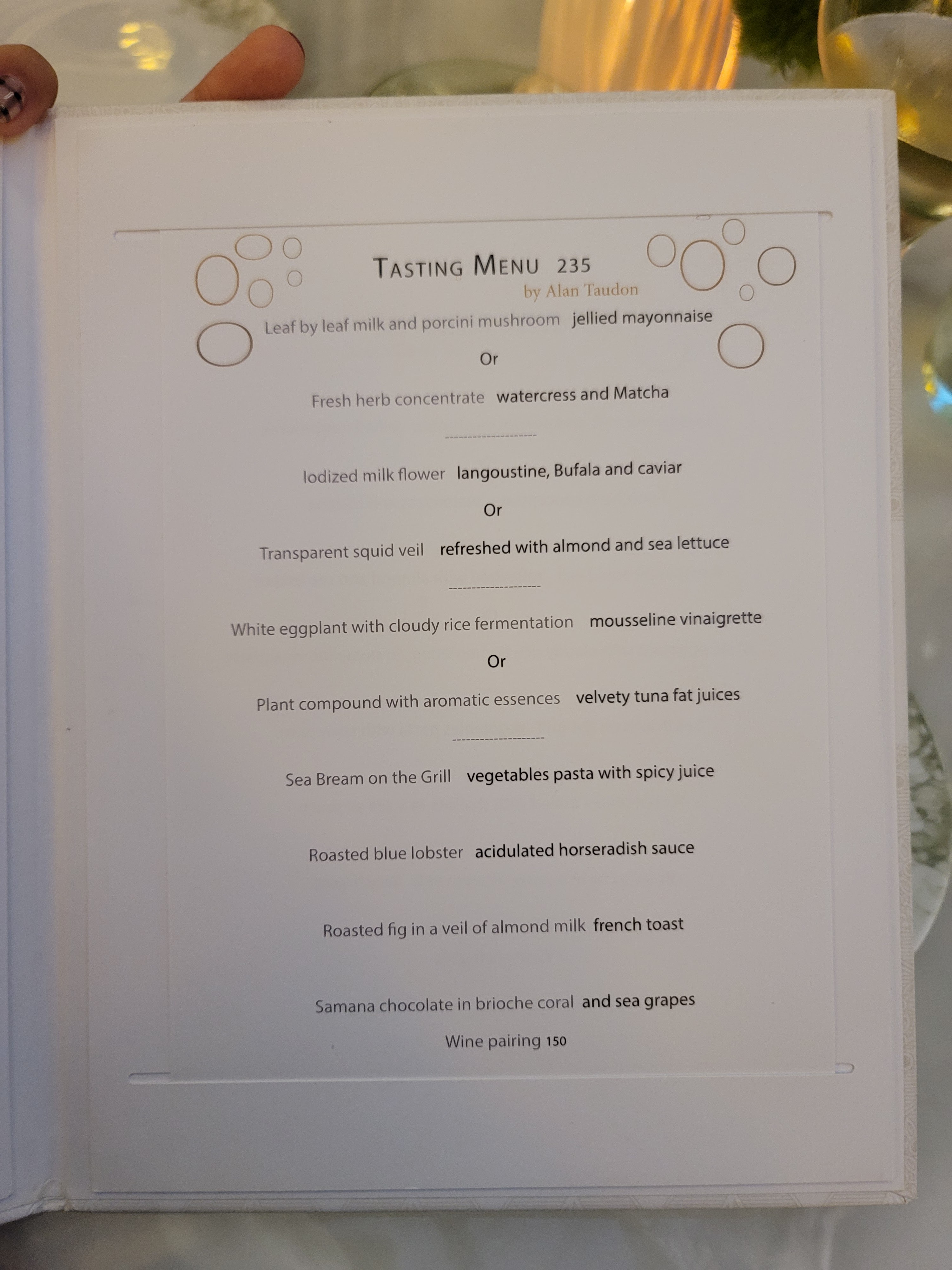 Super expérience. Lieu au top. Cuisine à la fois moderne et un peu tape à l'oeil mais les goûts sont au rendez-vous. Service en adéquation avec nos attentes. Ma femme enceinte a été particulièrement bien accompagnée pendant tout le repas. L'eau nous a été facturée 6 euros par personnes ce qui est adapté. Merci. Seul petit bémol: Le café expresso à 12€, c'est légèrement au dessus de la fourchette haute à ne pas dépasser. Nous reviendrons, ce fut une expérience inoubliable. Encore merci à toute l'équipe.