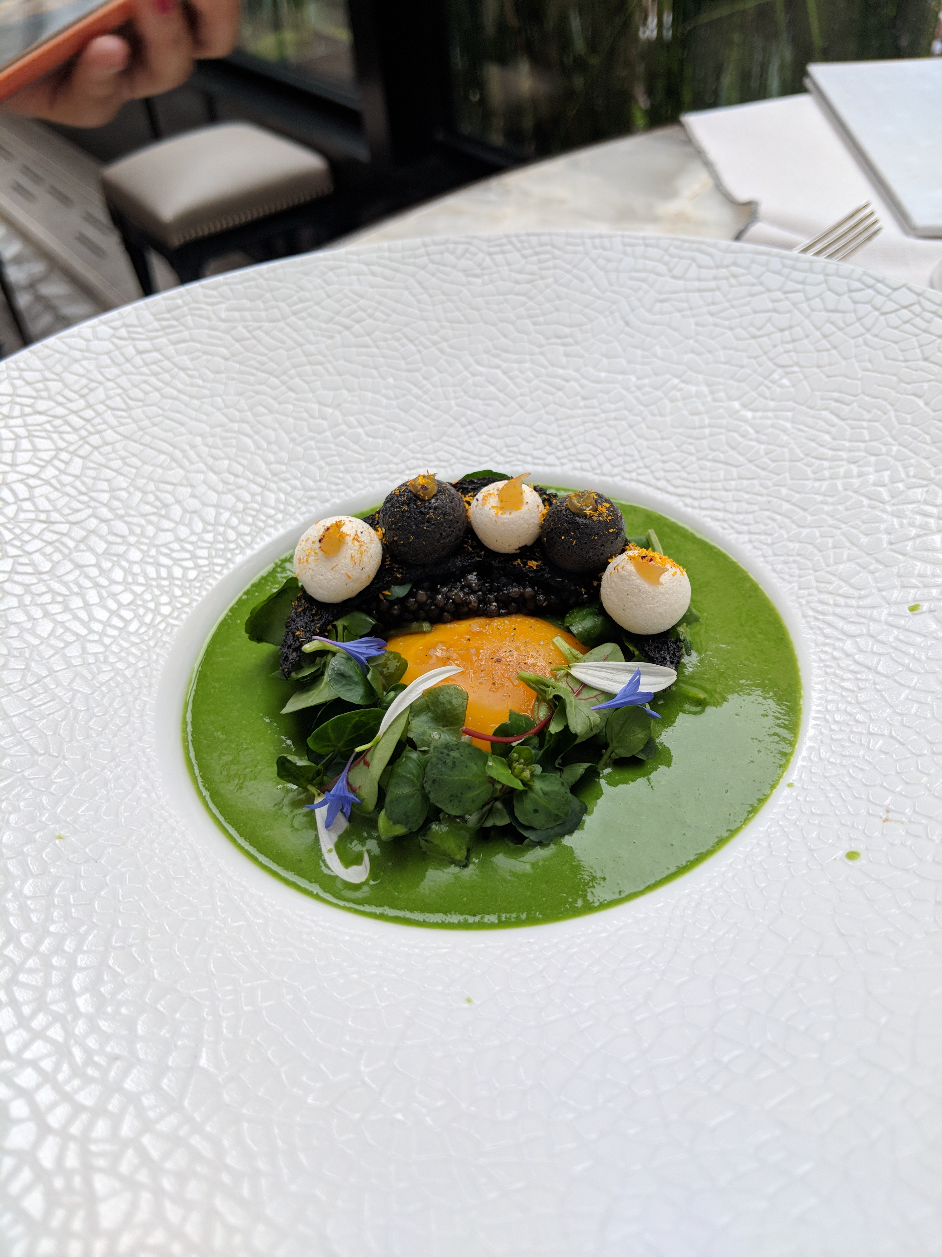 Ce restaurant offre une incroyable expérience gastronomique moderne. Nous avons eu le menu déjeuner à 3 plats, où vous pouvez choisir votre entrée, votre plat principal et votre dessert dans la liste du menu du déjeuner (un choix de 3 plats différents par plat). En plus des 3 plats, on nous a présenté diverses entrées, du pain et des petits fours à la fin du repas. Tous les plats étaient soit des fruits de mer, soit végétariens. Chaque plat a été présenté pour plaire aux yeux, les apéritifs ont été présentés sur des éléments uniques à base de plantes tels que des fruits coupés ornementaux et beaucoup d'attention aux détails sur les autres plats - ils disent que vous mangez d'abord avec vos yeux. Côté goût, la nourriture a été à la hauteur des attentes fixées par la présentation. Les saveurs étaient équilibrées et intéressantes, et chaque plat présentait des éléments de texture différents. Après le repas, le chef cuisinier est venu nous saluer, ce qui a bien clôturé le repas. Le service était raffiné, mais sympathique et accessible. De même, le restaurant était sophistiqué, offrait d'agréables vues sur la cour ornée de vergers. Le code vestimentaire était chic et décontracté.