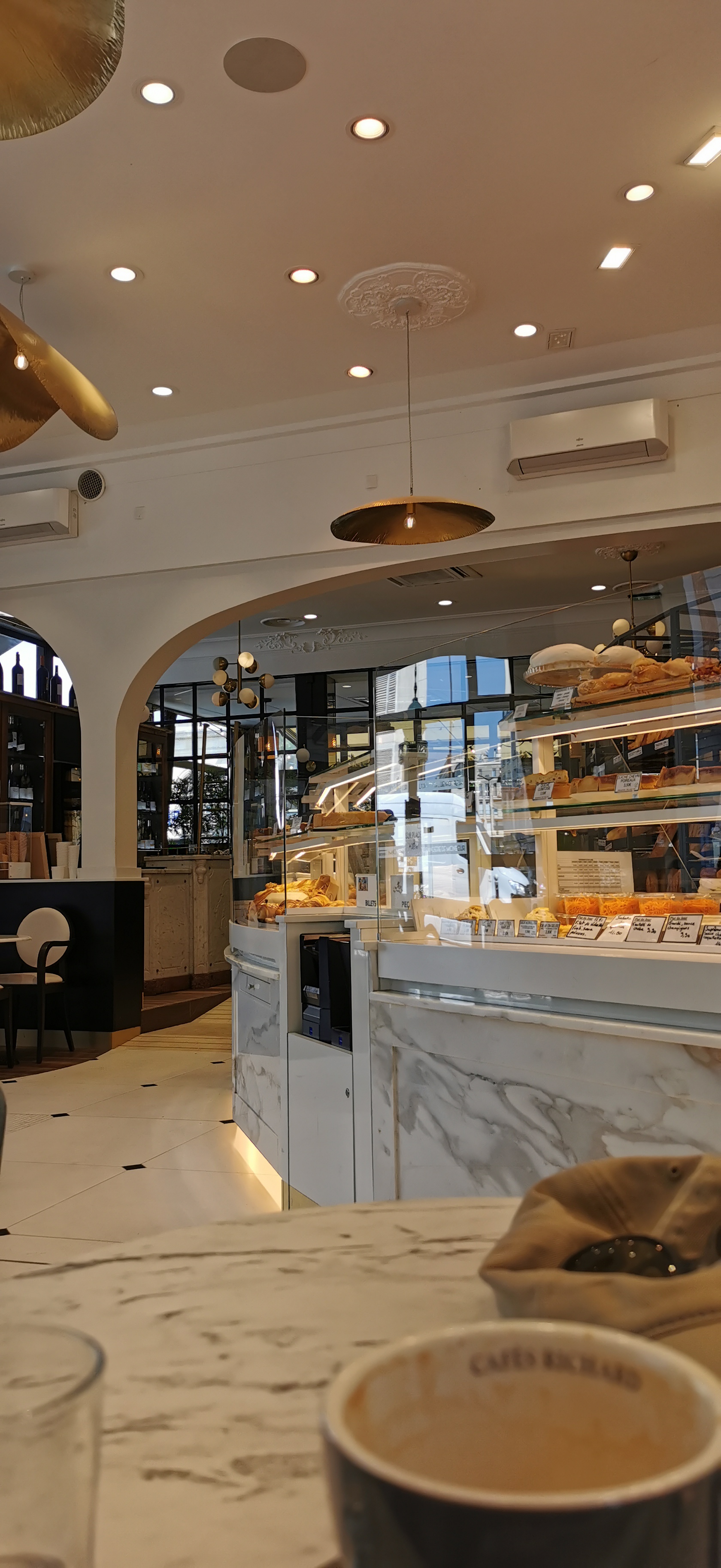 Le cadre est moderne mais beau (très réussi). Nous y avons bu 2 cafés au lait, bons mais trop chers à mon goût, l'emplacement se paie aussi. Fait important : l'état des toilettes est négligé (voir les photos).
