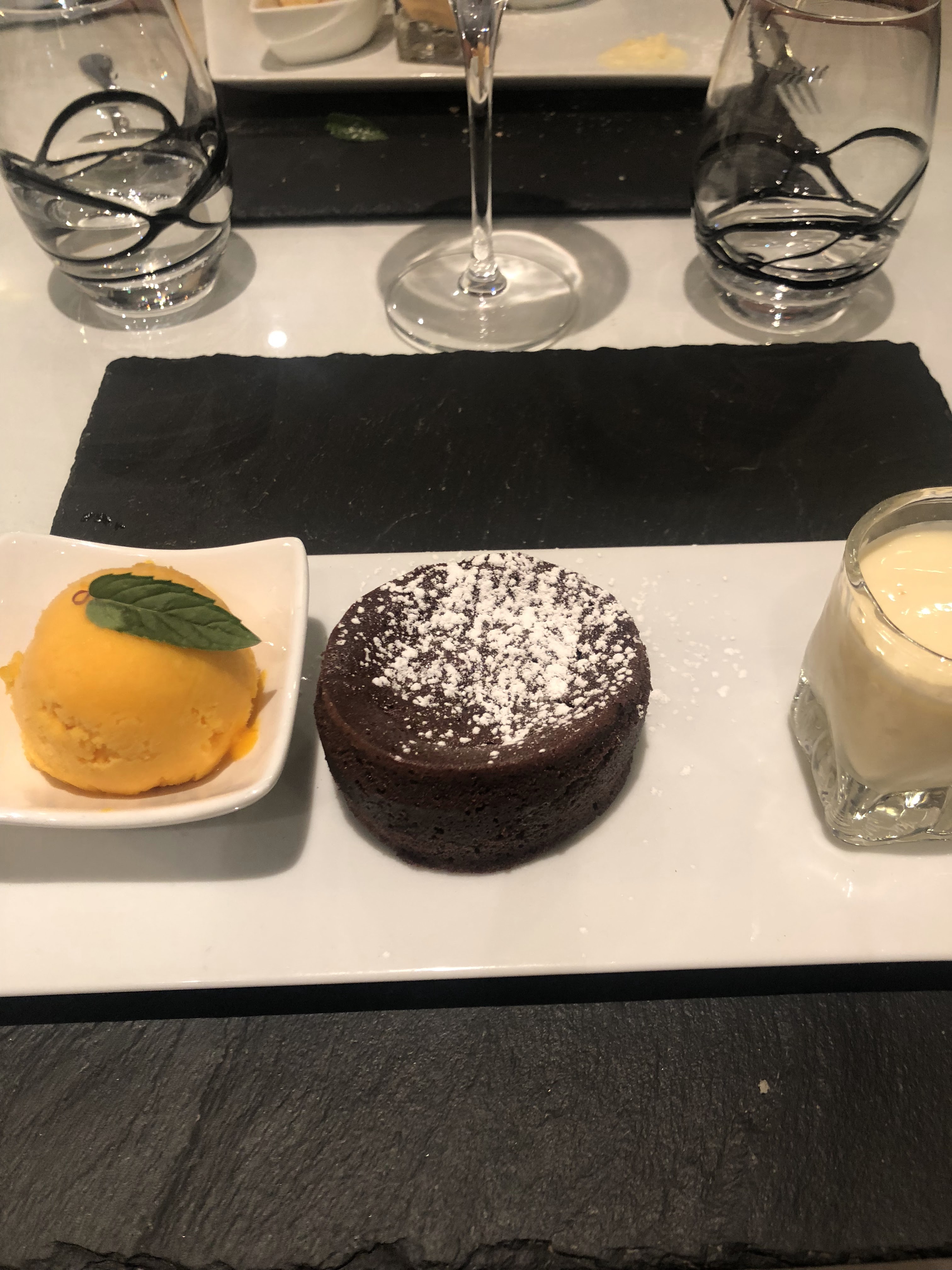 Quelle complexité dans les saveurs. Des mélanges à tout va, des fonds trop salés, (pas de chance peut être), un moelleux au chocolat extrêmement sucré avec un liquide vert au milieu qui n'apporte rien en saveur sauf une fois de plus d'ajouter du brouillard gustatif. Si vous avez des enfants dites leur de manger avant car leurs menus sont inversement proportionnels au prix. Sur des questions simples, on se fait remettre en place en nous expliquant que le chaud de la clémentine fait fondre la mousse, évidemment c'est obligatoire de mettre la clémentine sur une mousse comme s'il n'y avait pas assez de place dans l'assiette. Et monter autrement l'assiette... Bref beaucoup trop cher pour la prestation. Même en région parisienne nous n'atteignons pas ces prix ubuesques. Je suis content de l'avoir découvert, cela me permet de savoir que c'est un endroit que je vais éviter dans le futur.