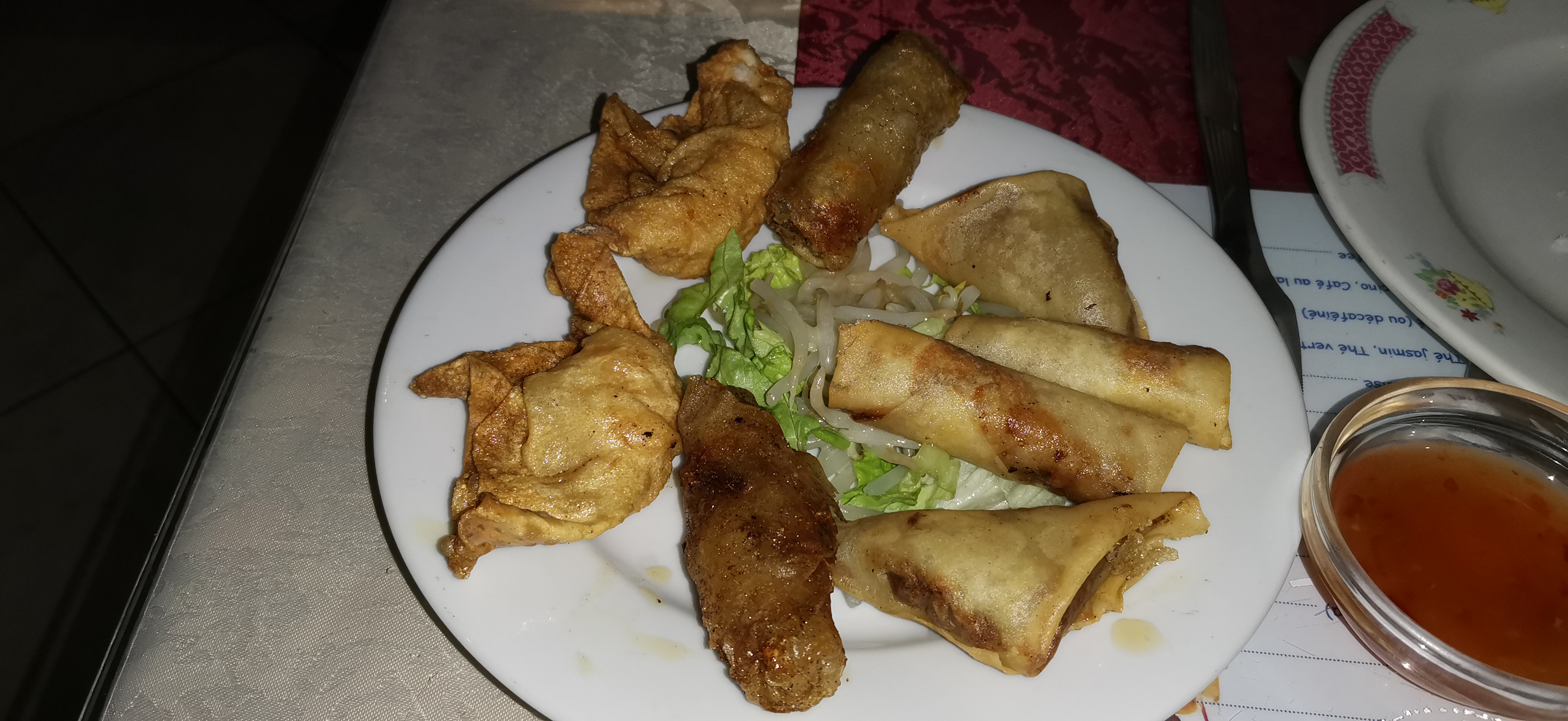 Des portions assez généreuses pour le plat même si les desserts (beignets à l'ananas et à la pomme) sont assez petits. J'ai été assez déçue : un poulet croustillant qui n'est pas croustillant avec surtout de la peau, un boeuf saté qui était assez quelconque. Par rapport aux commentaires et à la note, je m'attendais à mieux. C'est un restaurant pas mal, mais rien d'extraordinaire.