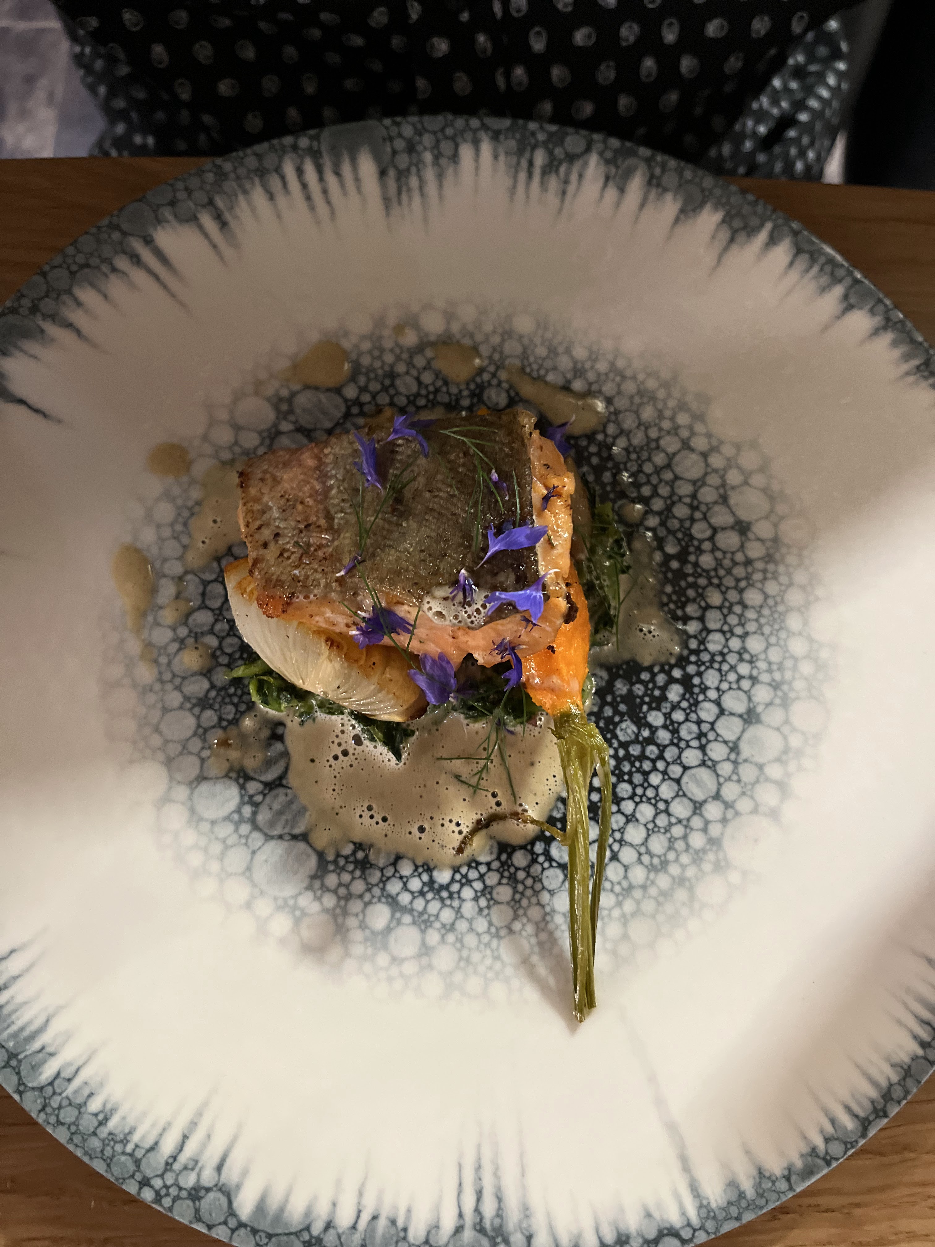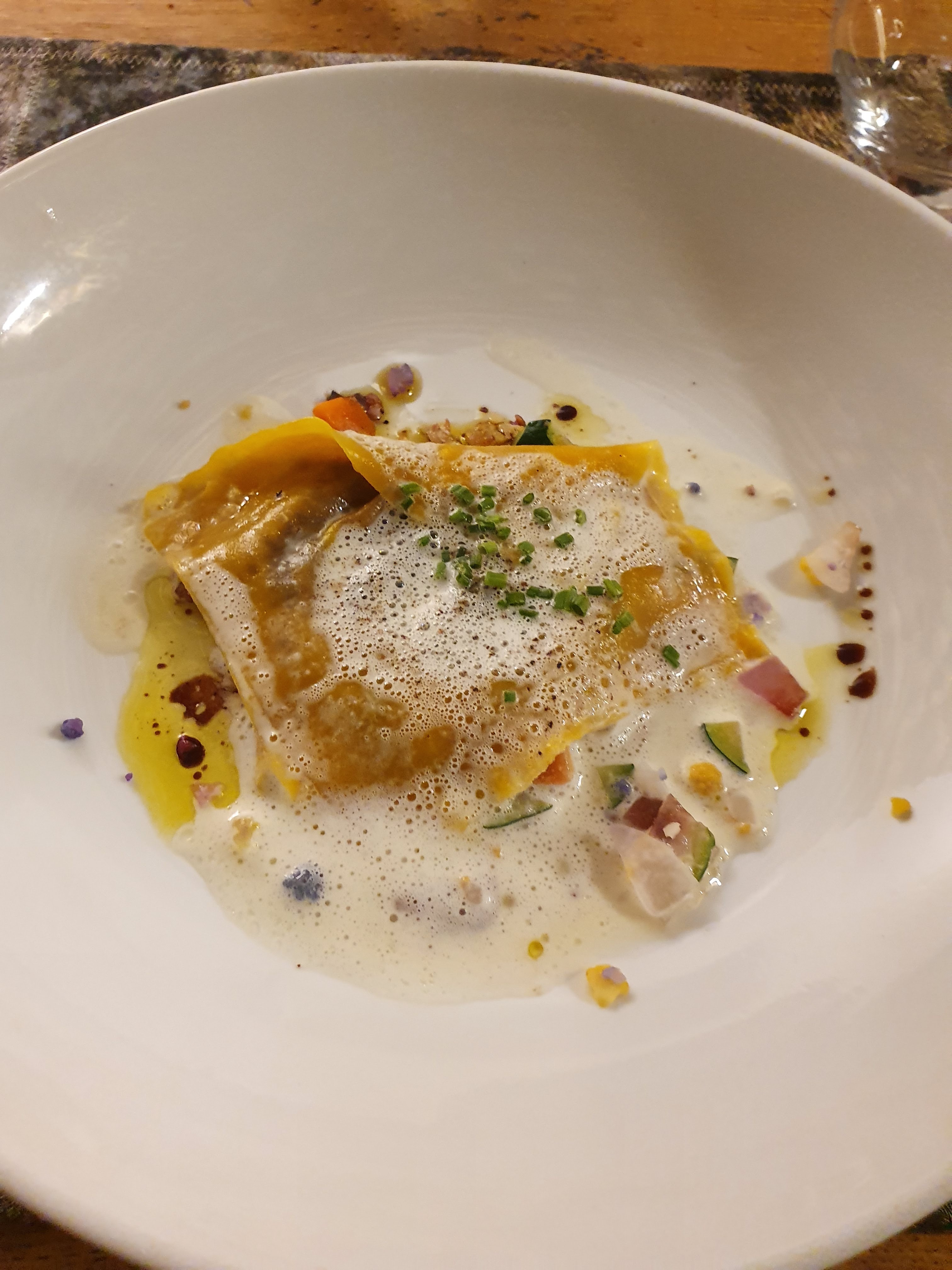 Très bon restaurant , bel endroit . Truite excellente pleine de saveurs sur son lit d’herbes fraîches, J’aurais bien aimé un raviole de plus en entrée . Je recommande +++ , un bon semi gastro