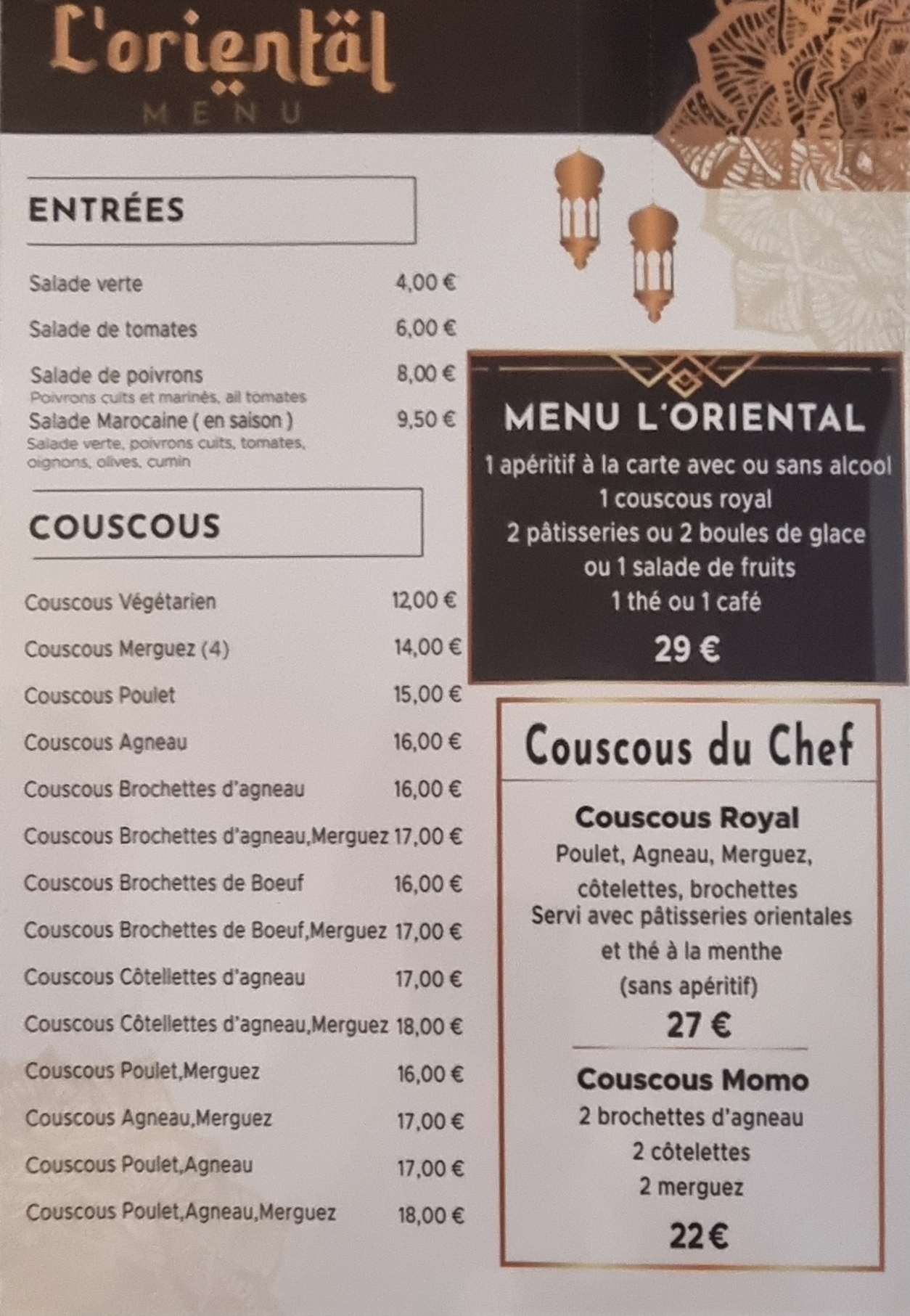 L oriental pas très oriental un couscous royal 27 euro pour avoir 1 merguez 1 pilon poulet 1 brochette trop chère pour se que sais un couscous de cantine la seul chose que j'ai aimer c'est le thé vert qui était très bien voilà mon expérience dans ce restaurant serveuse et patronne sympathique également