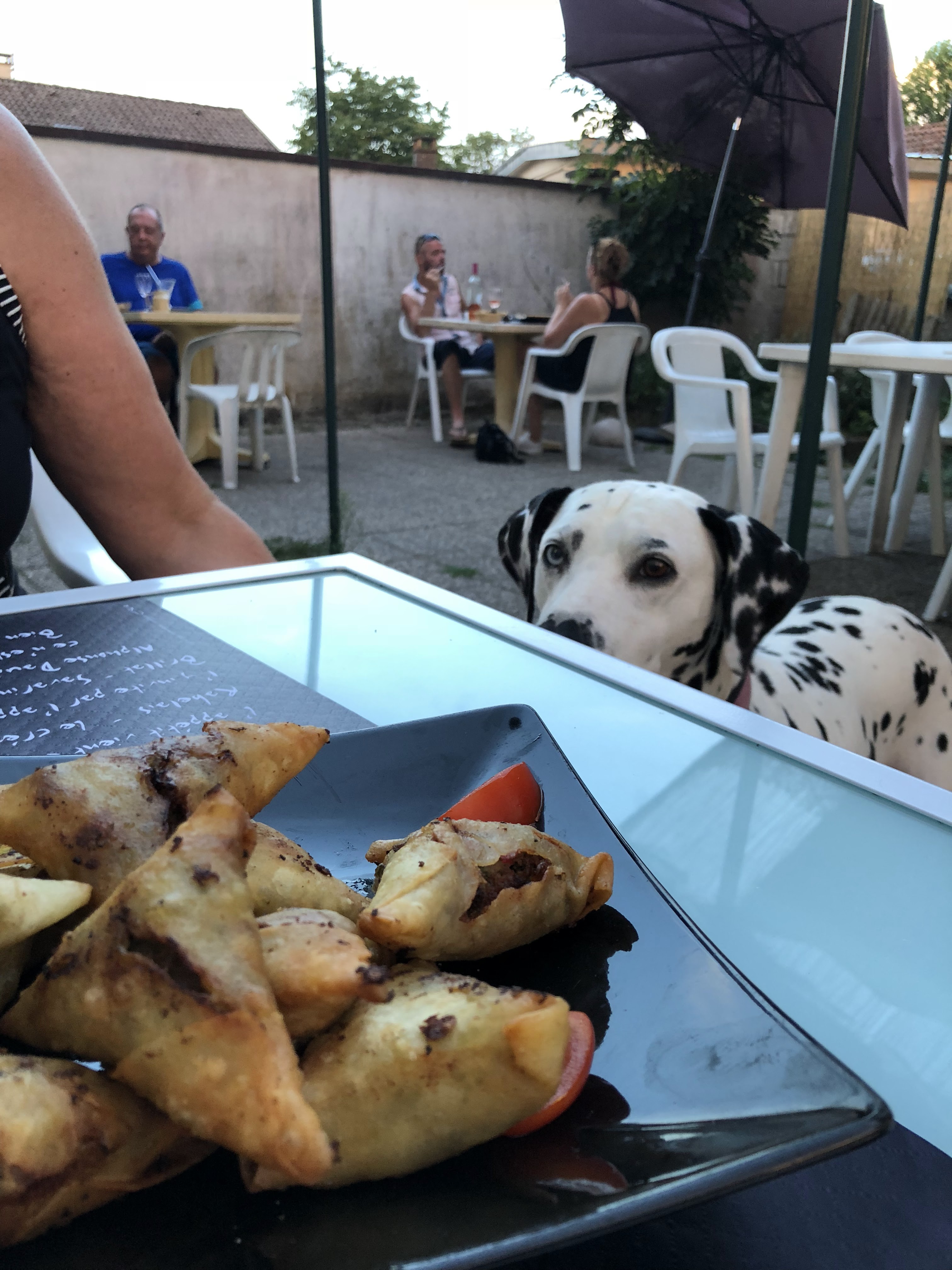 Julie la serveuse m’adore. Son papa à la cuisine aussi et puis ma « maman » me donne toujours un petit morceau de sa pizza au pistou. Miam miam. Par contre je n’ai pas droit aux délicieux sambos...et puis moi aussi j’aime bien les poules élevées en plein air....(voir photo). Merci Bernard pour ton animation lors de la fête de la musique