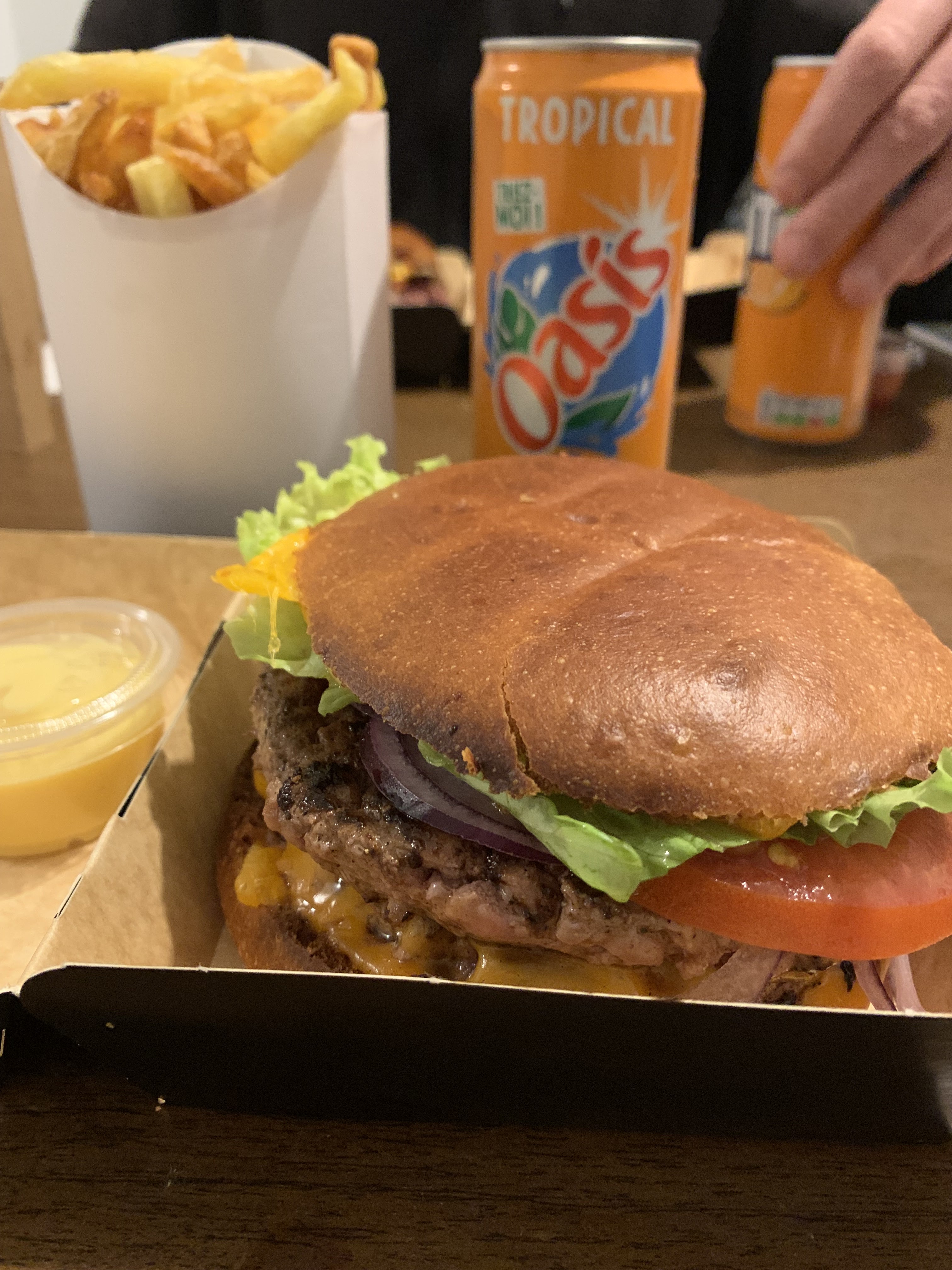 Bon burger avec des vrais steack haché et de vrai frites, pas des trucs surgelés et cuits directement. Au début j'ai trouvé ça un peu chère mais avec les produits utilisé c'est cohérent et ça cale bien comme il faut ! 🤤 Faudrait juste mettre une pancarte car le bâtiment est rester longtemps fermer, du coup quand on regarde on voit pas forcément que ça a été repris, et décalé la cuisson dans la cuisine pour éviter les odeurs de cuisson dans la salle. Prochaine fois je prendrai juste un chease par contre car le double faut vraiment avoir faim ! 🤣