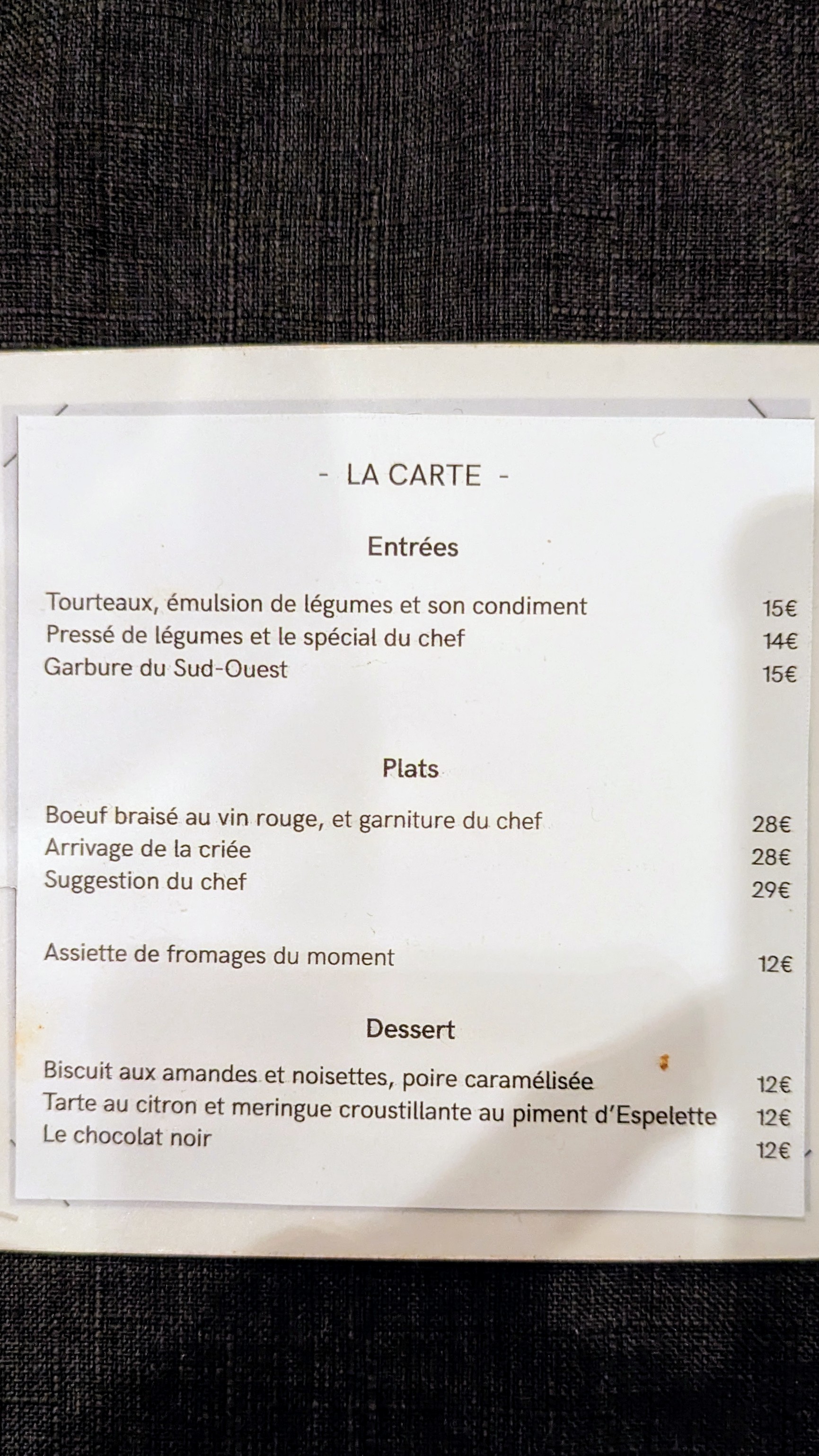 Nous avons été ravis de découvrir ce restaurant. Accueil agréable et sympathique. Une carte limitée avec des produits de saison et de qualité. Cuisson parfaite des viandes et des poissons. Nous nous sommes régalés du début à la fin. Avec un peu plus de légumes pour accompagner les plats ce serait parfait.