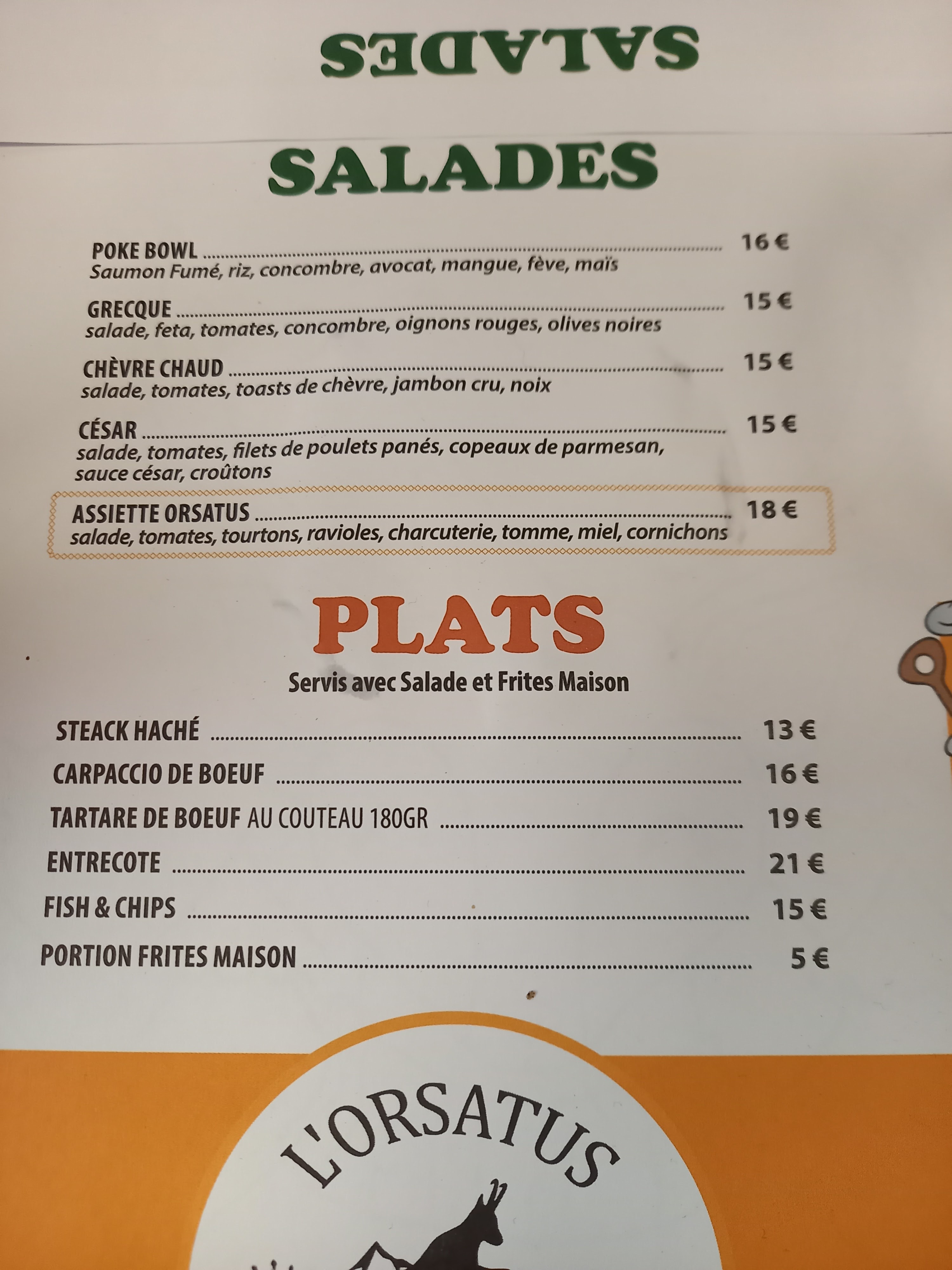 L'Orsatus est un restaurant chaleureux, la serveuse est agréable et souriante, l'emplacement est très bien situé, très bon rapport qualité-prix, le tartare de 180 grammes que j'ai manger était frais et le fondant au chocolat délicieux, arrêt obligatoire en venant sur Orcières.