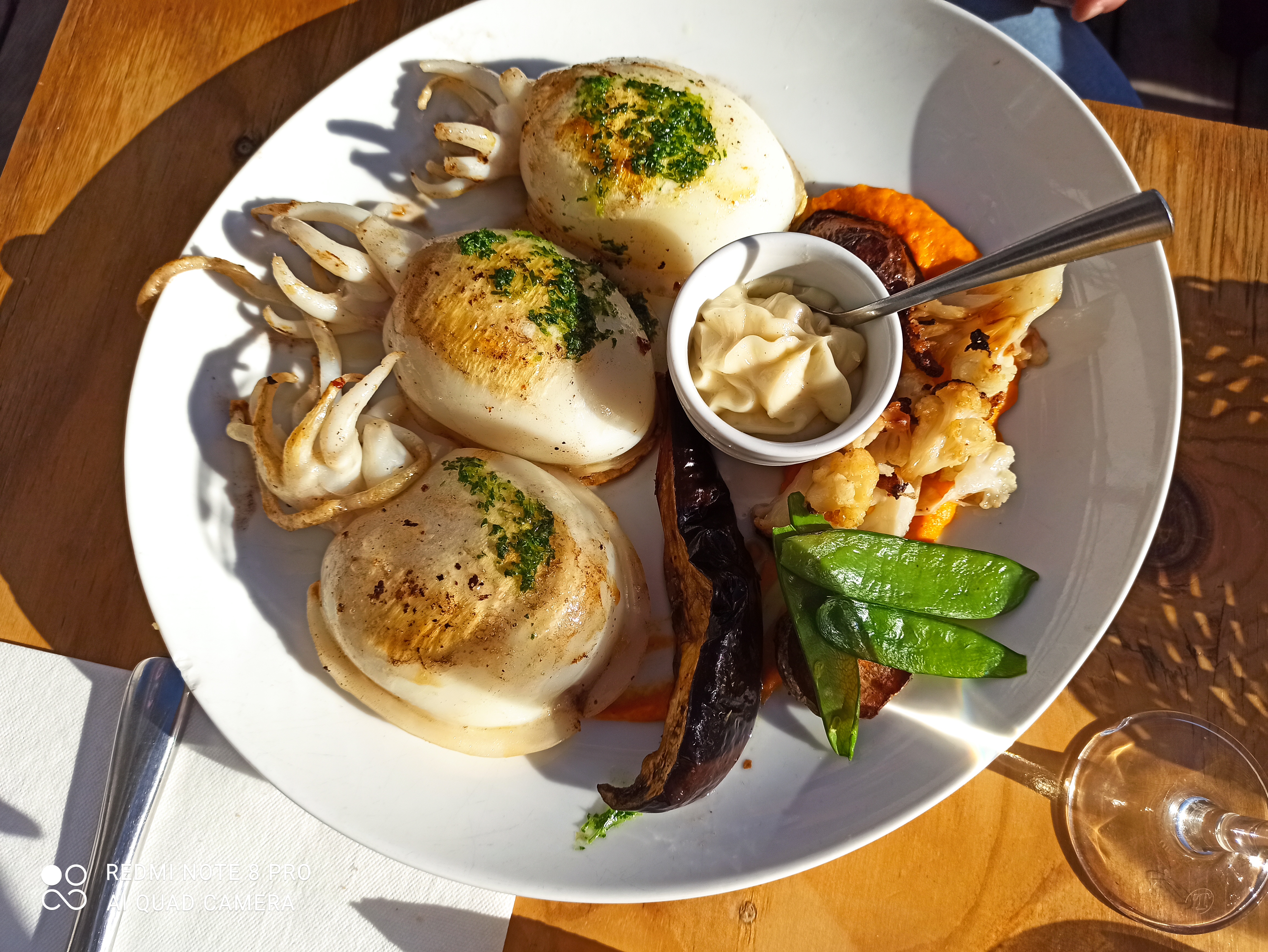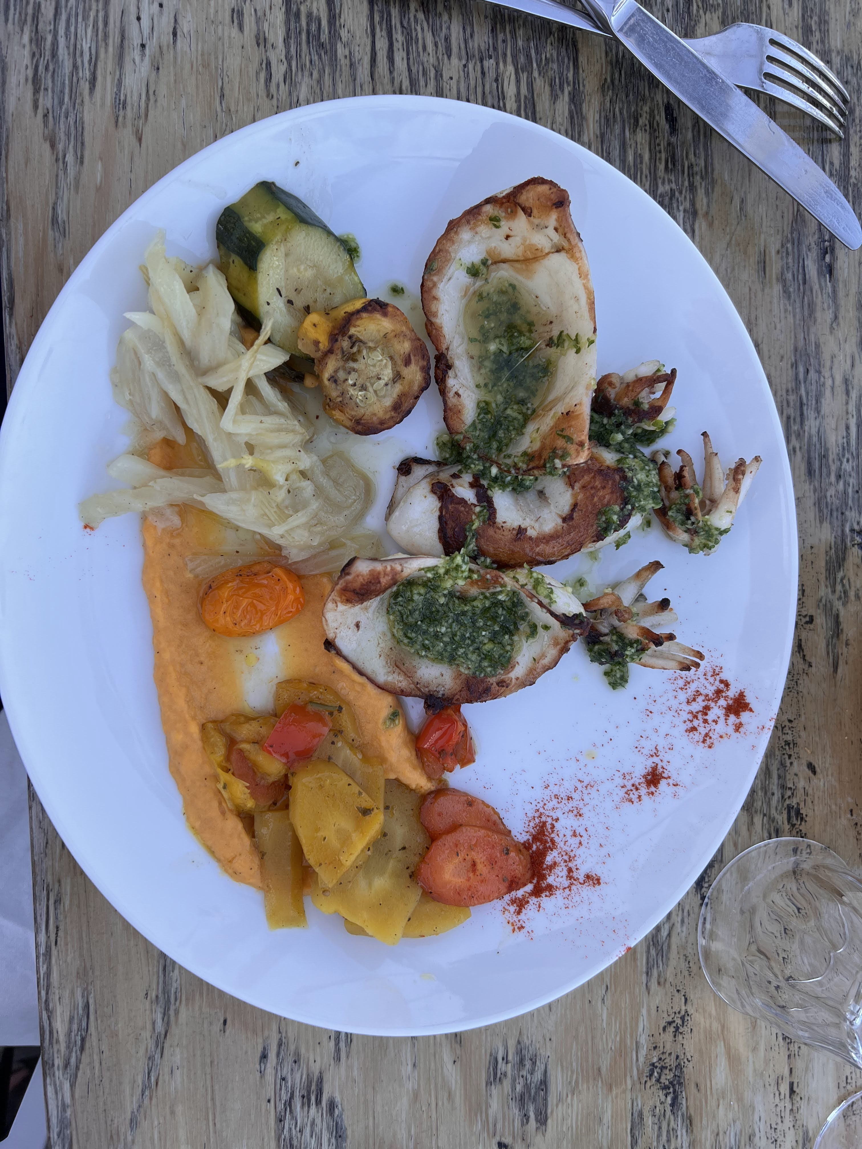Déjeuner très sympa. Gravlax de Thon, Huîtres et Moules chaudes délicieuses. Grillade de porc avec une sauce miel-moutarde superbe et des seiches incroyables. Un grand merci pour l'accueil ! La déco est super chouette, couleurs pétillantes. Et le tout au bord de l'eau. À refaire en été pour profiter au mieux de la terrasse.