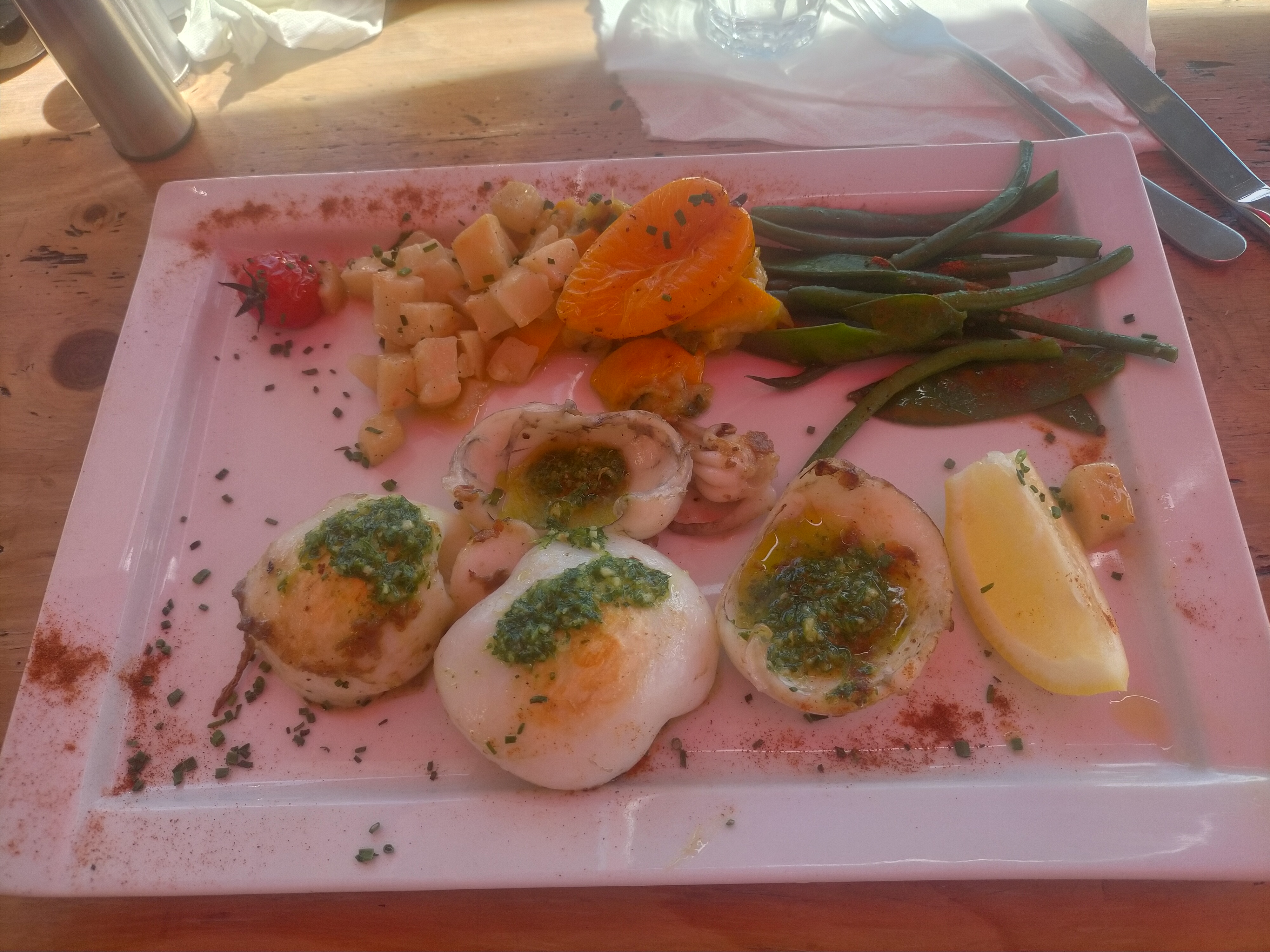 Le cadre est idéal, vue sur l’étang de Thau, à côté d’un parking et avec une esplanade où les enfants peuvent jouer. Le service est sympathique et décontracté mais aussi débordé je pense par des erreurs dans la prise des réservations. Du coup beaucoup d’attente . Au niveau cuisine on a seulement goûté la seiche et les moules qui étaient bonnes.