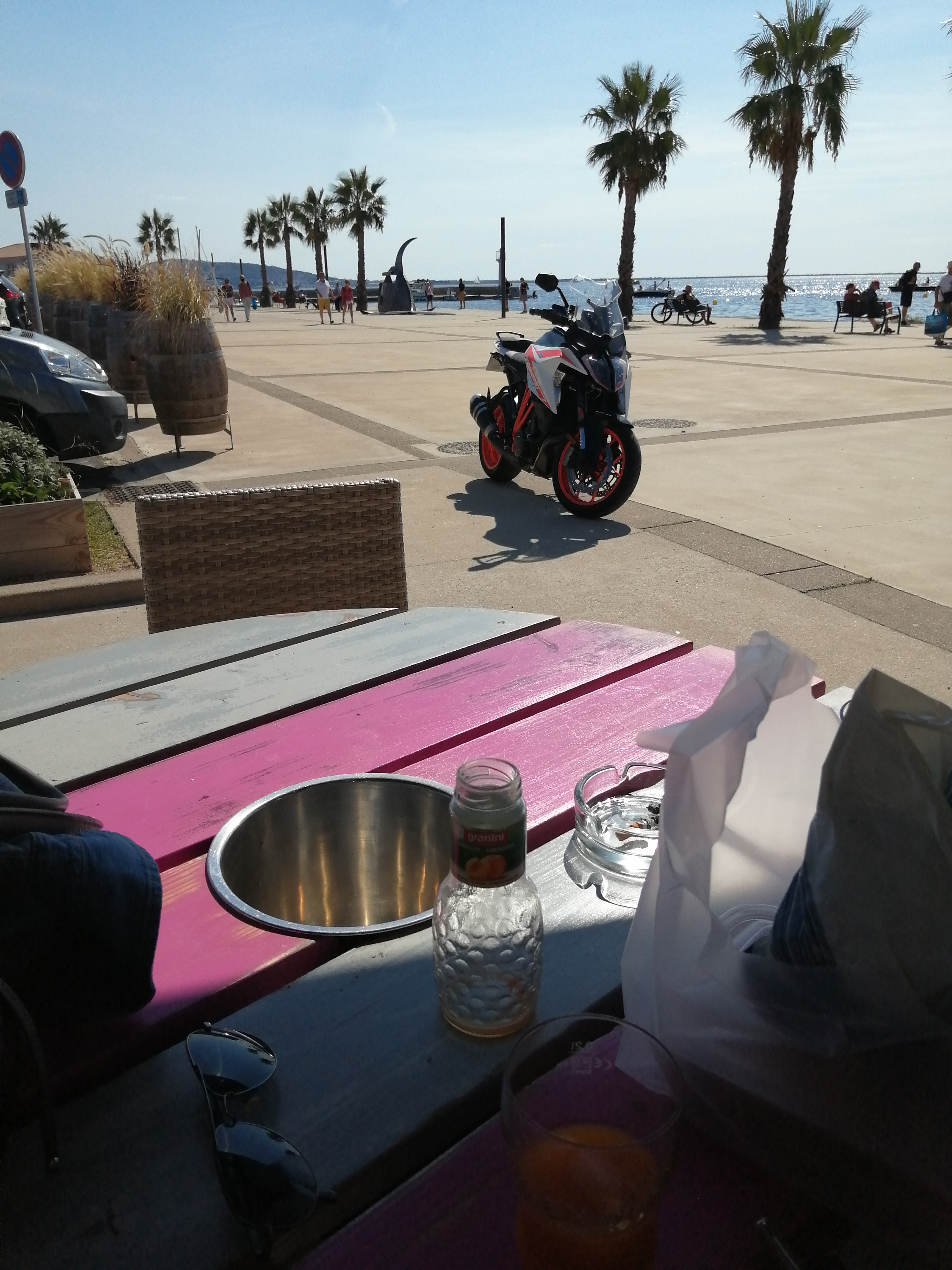Petite pause en terrasse face à l'étang de Thau. Très bien placé, parking à côté et vue magnifique. Le restaurant était complet pour le déjeuner. Nous ne venions pas manger mais prendre une boisson avant de repartir à vélo. Nous avons été servis par un jeune homme (certainement saisonnier) très agréable et souriant. Mais en partant le patron, tellement absorbé par sa terrasse remplie de monde, n'a pas répondu à notre au revoir...
