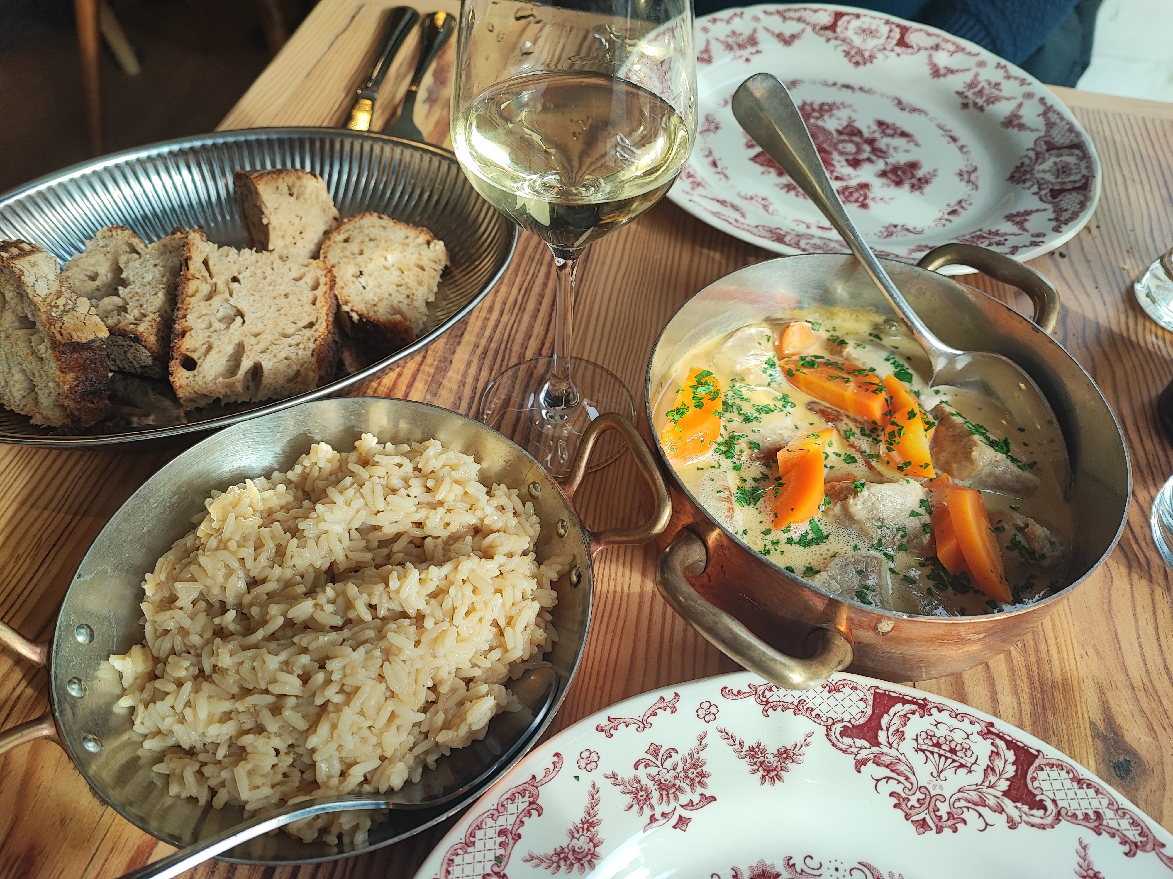 Dans une salle à la déco originale, légère et lumineuse nous avons apprécié ”la poule au pot ”.