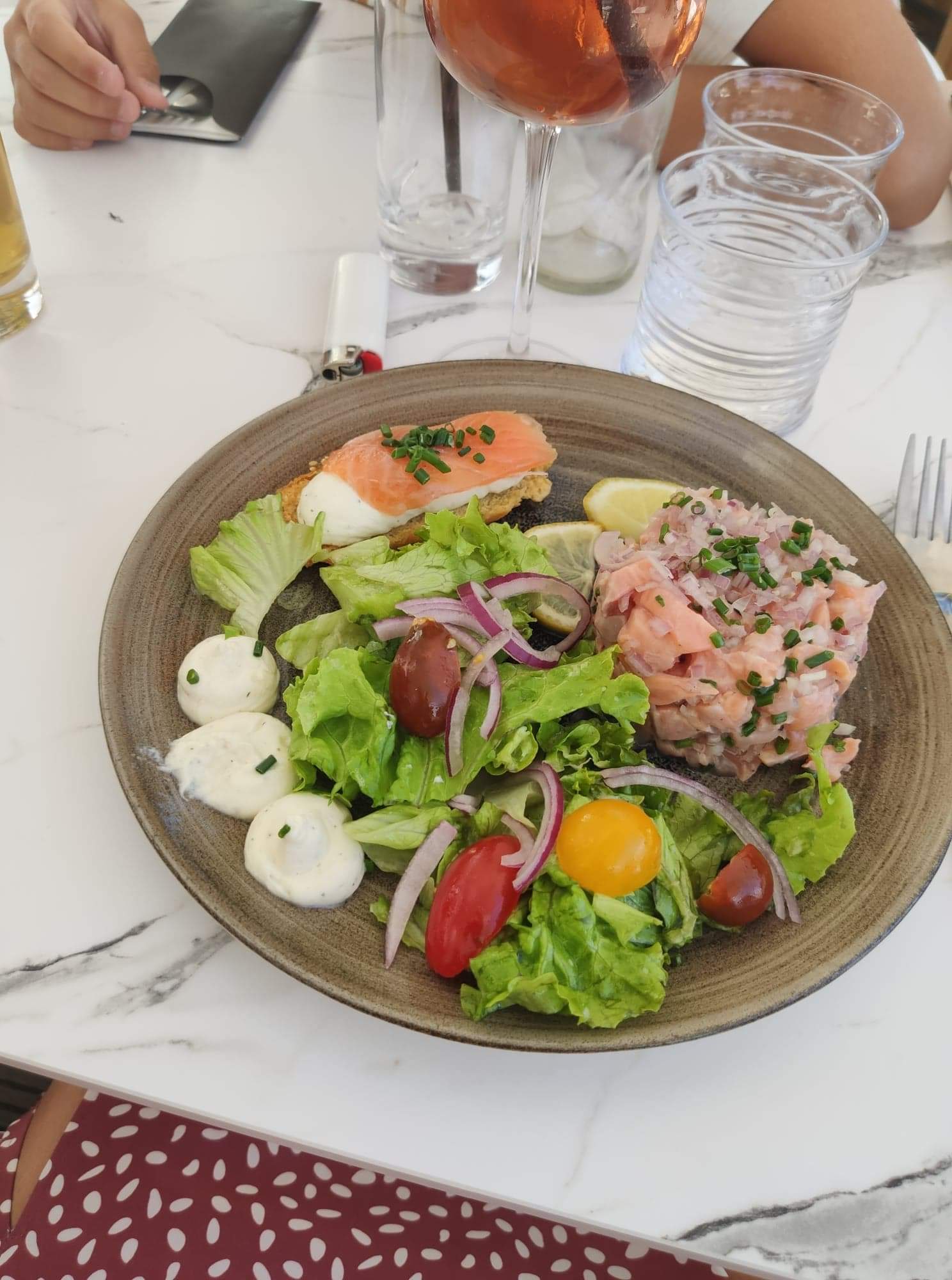 Mitigée... Tout était parfait, rien à redire sur l'apéritif et les planches de fritures, jusqu'à ce qu'un de nos plats de fasse attendre Beaucoup trop longtemps.. En effet, il avait été servi à une autre table et nous avons dû nous manifester car nous voulions attendre de manger tous ensemble mais difficile de laisser les huîtres dans les assiettes indéfiniment. Nous sommes patients, ça peut arriver.. Mais finalement, ce tartare de boeuf tant attendu a été accompagné d'une certaine déception: beaucoup trop relevé même pour moi qui l'ai goûté! Ma fille a pensé que la bouteille de tabasco était tombée dans l'assiette 😕. Il serait plus judicieux de proposer les tartares non préparés afin de se les agrémenter aux goûts de chacun. (Ce sera pour nous l'expérience qui fera qu'on ne prendra plus de tartare préparé) Dommage. Un goût d'inachevé.