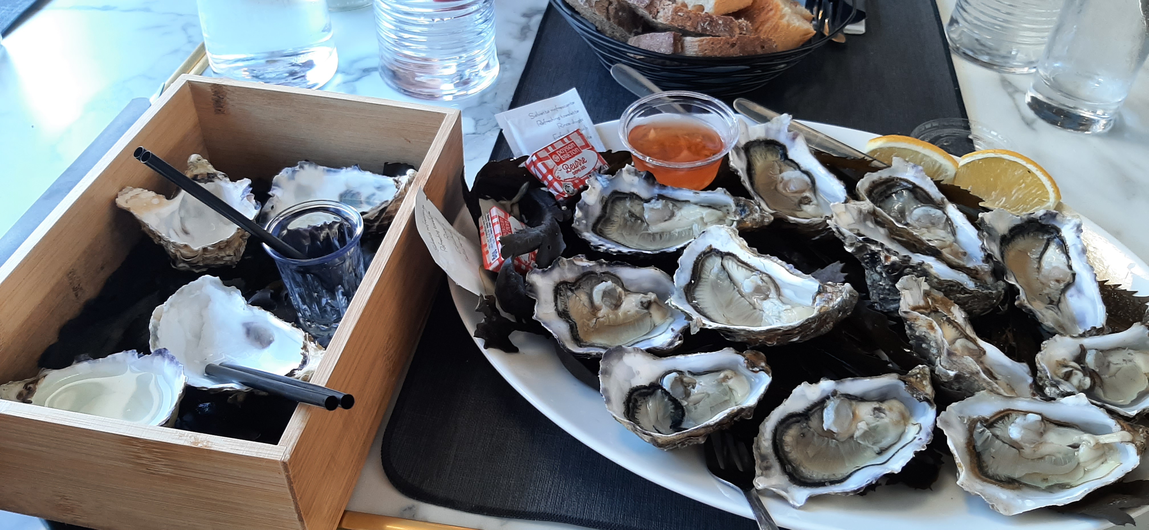 Accueil sympathique, merci 😁 J'ai mangé de très bonnes huîtres, goûteuses accompagnées de vinaigre à l'échalote, de pain de beurre salé et de citron. Très bon moment, grâce notamment au joueur de saxo. A refaire !