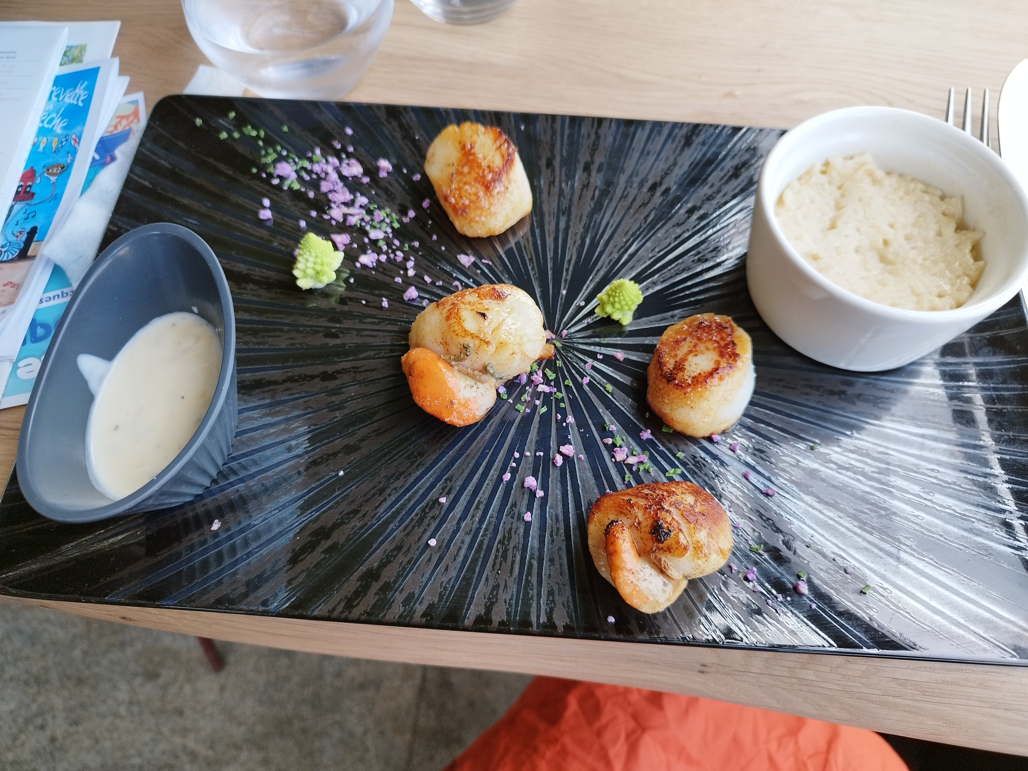 Nous y sommes allées avant hier pour la fête de la crevette et puisque nous sommes dans les mois en bre, autant nous régaler de fruits de mer. J'ai découvert les amandes persillées sur un lit blanc de gros sel. Un régal! Moi, qui n'aime pas les amandes crues, je plébiscite cette recette et j'ai saucé avec mon pain même si je sais que cela ne se fait pas. La faute à la sauce!😊. La poêlée de noix de Saint-Jacques étaient cuites exactement comme il le fallait (ni trop, ni pas assez) et la sauce et le risotto les accompagnant étaient délicieux. Enfin, les desserts étaient très réussis, la classique tarte tatin chaude à souhait et le crumble aux poires et amandes à tomber. Service rapide et attentionné. Un sans faute. Très beau cadre avec vue sur le vieux bassin, le port de la carte postale. Toilettes très propres. Une adresse à retenir.