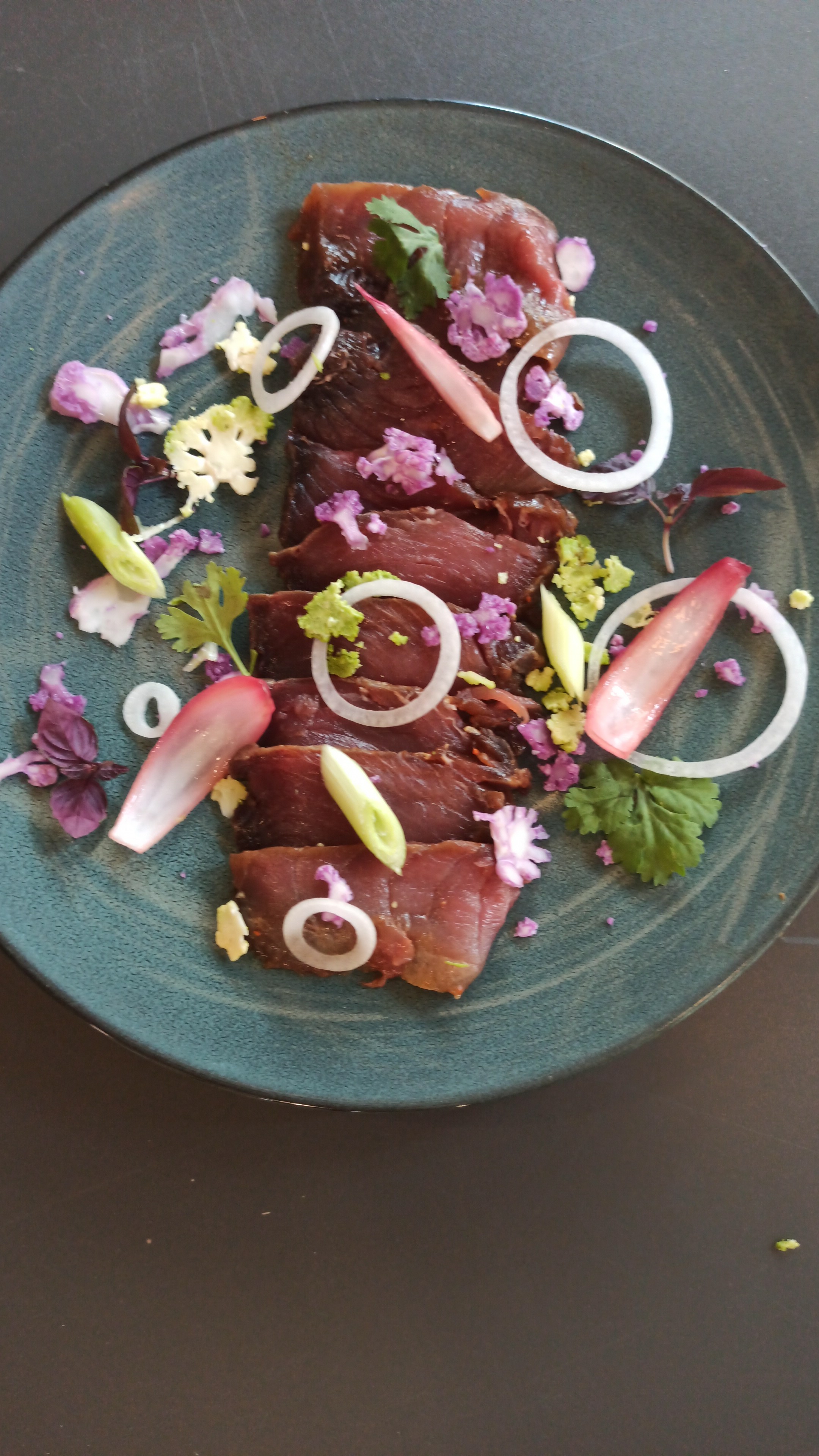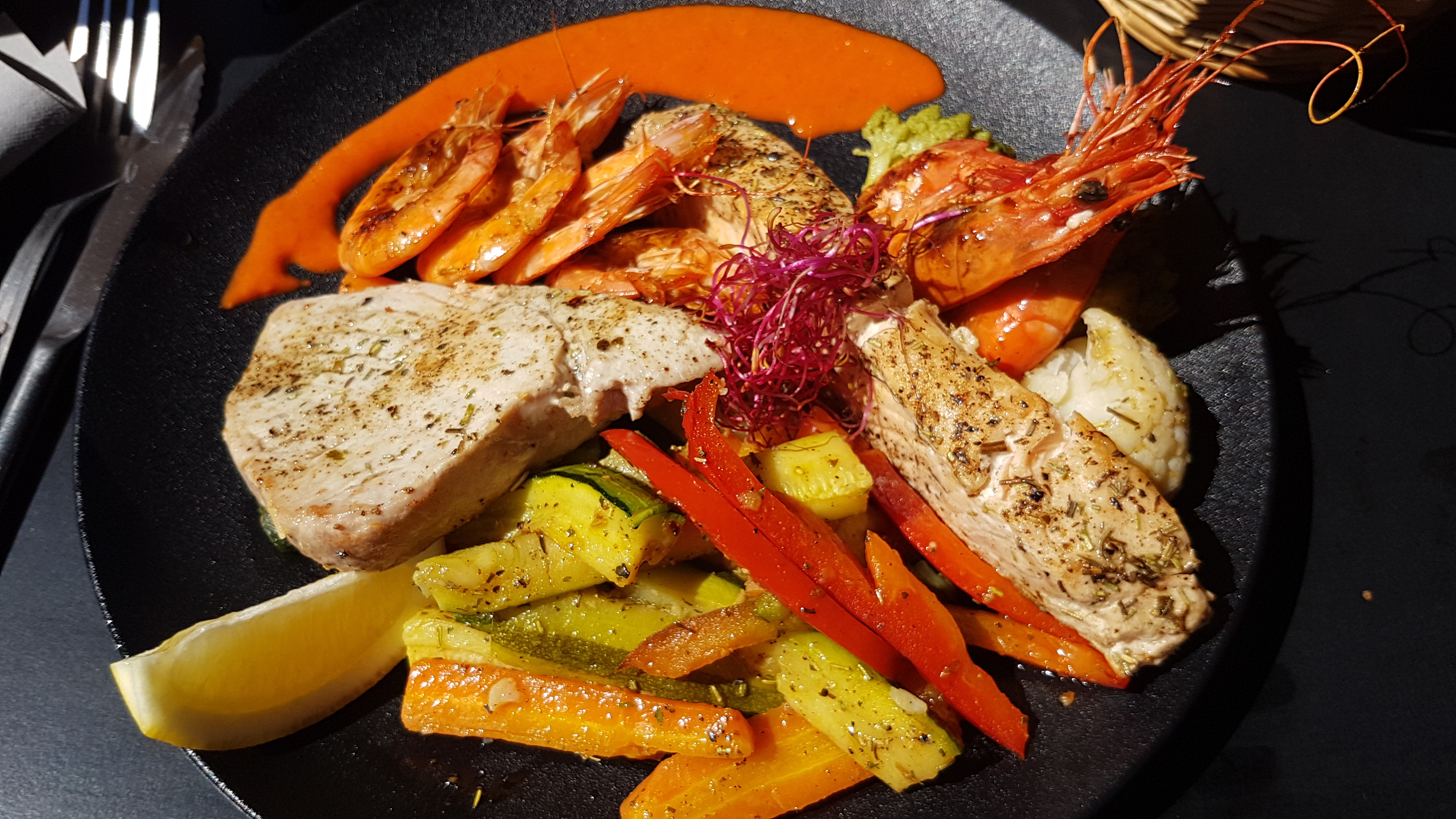 Première à inaugurer cette délicieuse salade revisitée par le Chef Alexandre avec généreux morceaux de thon mi-cuit, un vrai régal et très frais.