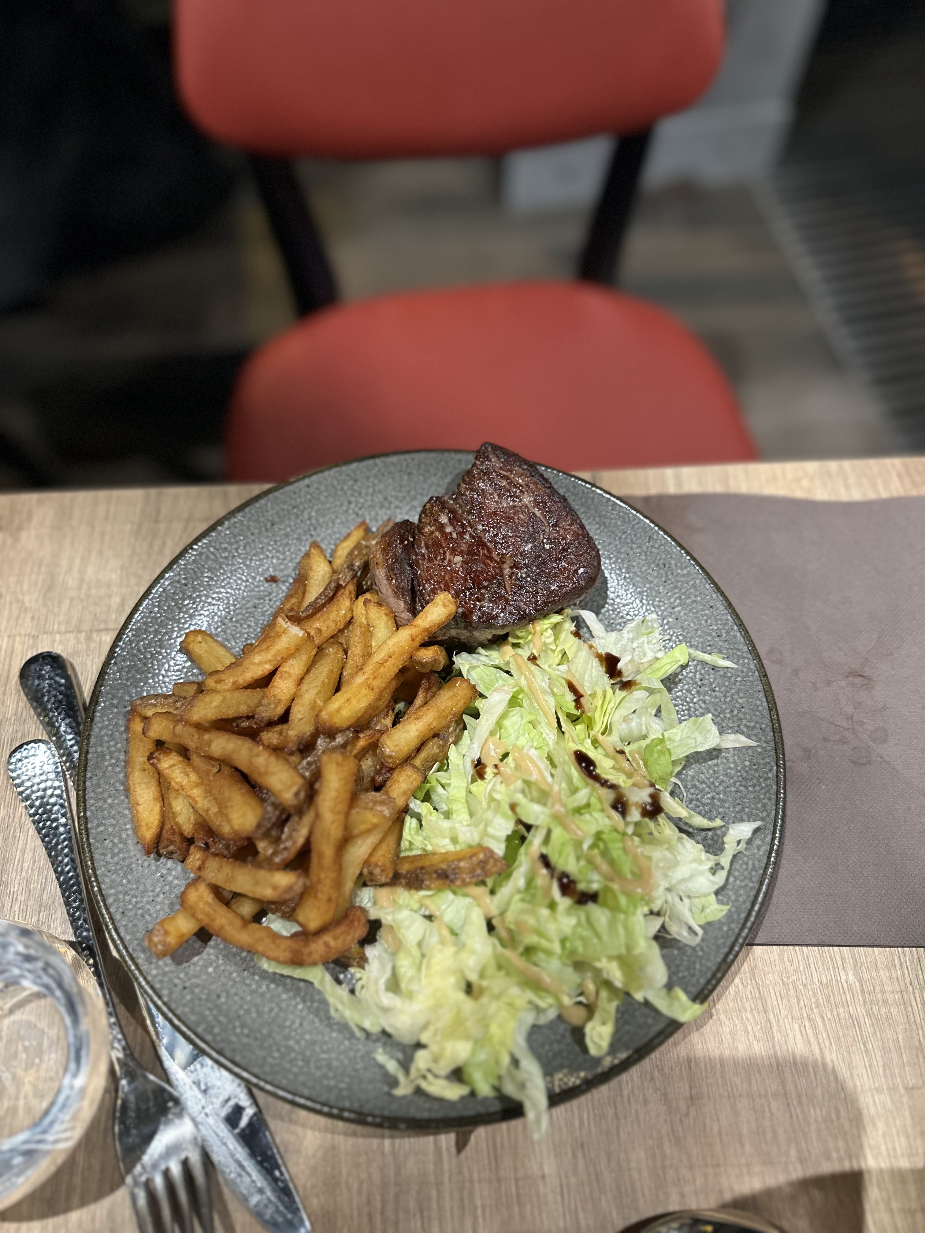 Enfin un restaurant qui nous accueille sans réservation à l'avance et qui se soucis de ses clients tout le repas. Chef qu'on voit cuisiner et maître d'hôtel hyper pro. Nous voulions de la bonne viande de bœuf d'un petit elevage local. Tout y était ! Cuisson parfaite qui nous permettait de déguster l'excellent bœuf avec la specialite de truffade et l'eau pétillante d'ici Un regal
