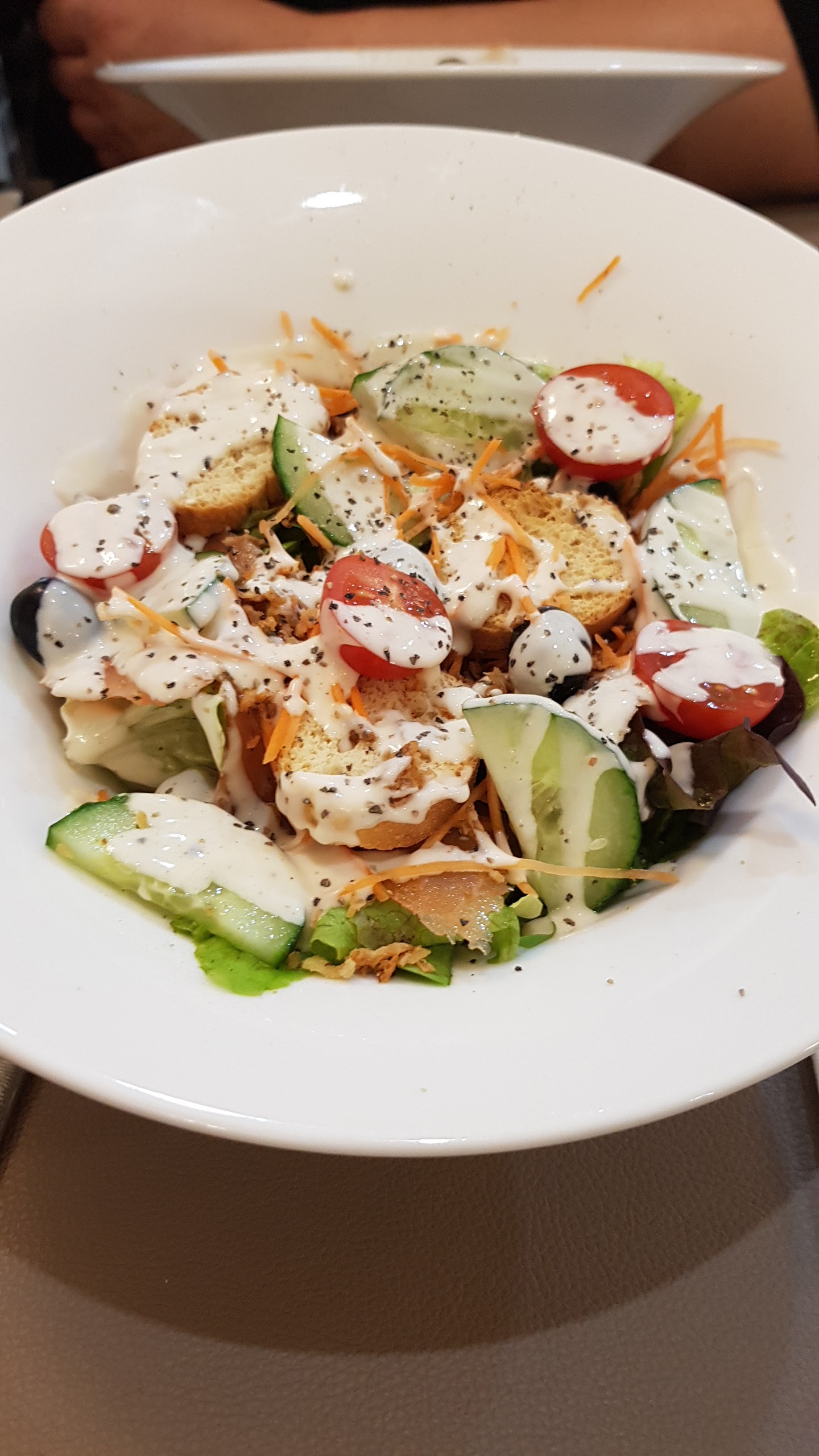 Bonne salade mais je regrette de ne pas avoir pu commander de tagliatelles au poulet qui apparemment ne sont servies que le midi mais ce n'est précisé nulle part. Je regrette également de ne pas avoir pu utiliser mes tickets restaurant qui ne sont acceptés que le midi, si j'avais su tout ça en avance je serais allée manger ailleurs.
