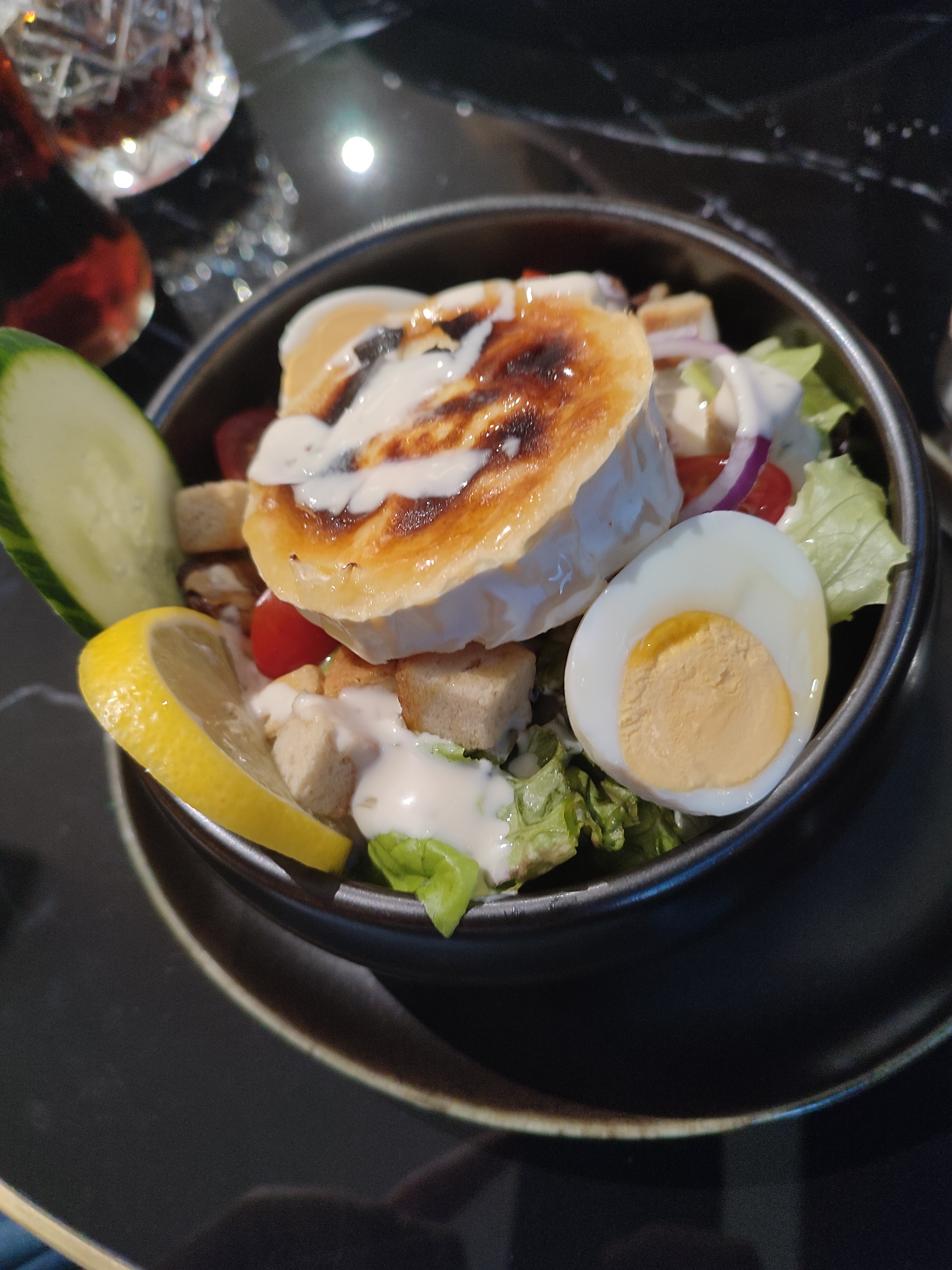 Endroit d'une déco j'adore 😍 Choix de plats et viandes variées. Salade César avec une viande façon tandoori petites tomates cerises sucrés 👌 1ere fois et pas déçu du tout. Equipe dynamique et sympa A refaire☺️