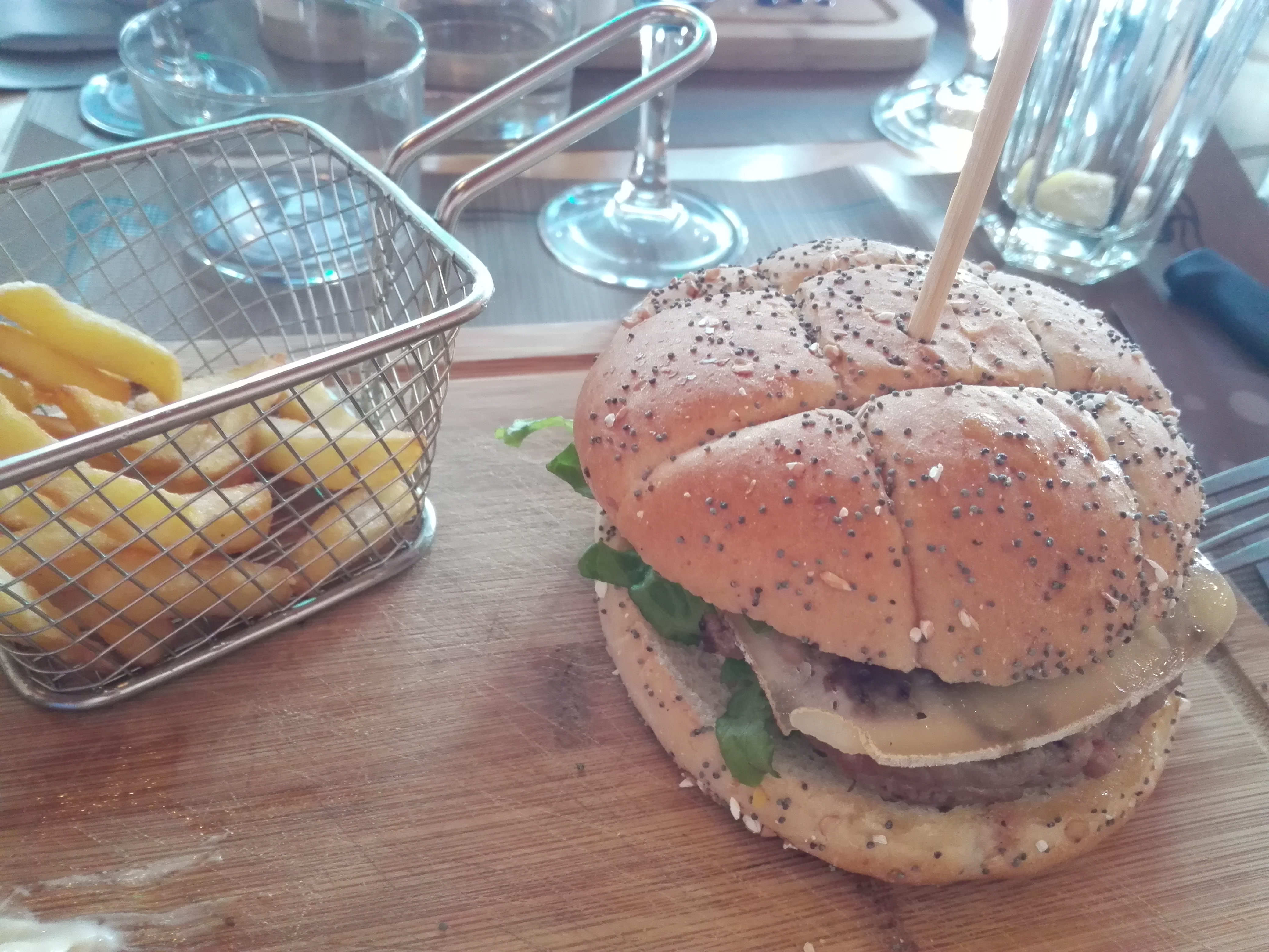 Pas ouf, serveur désagréable à souhait (impression de le déranger constamment et aucune hospitalité), frite surgelé, Burger très classique avec steak trop cuit (alors que demandé saignant), verres en carton… ouai franchement pas ouf