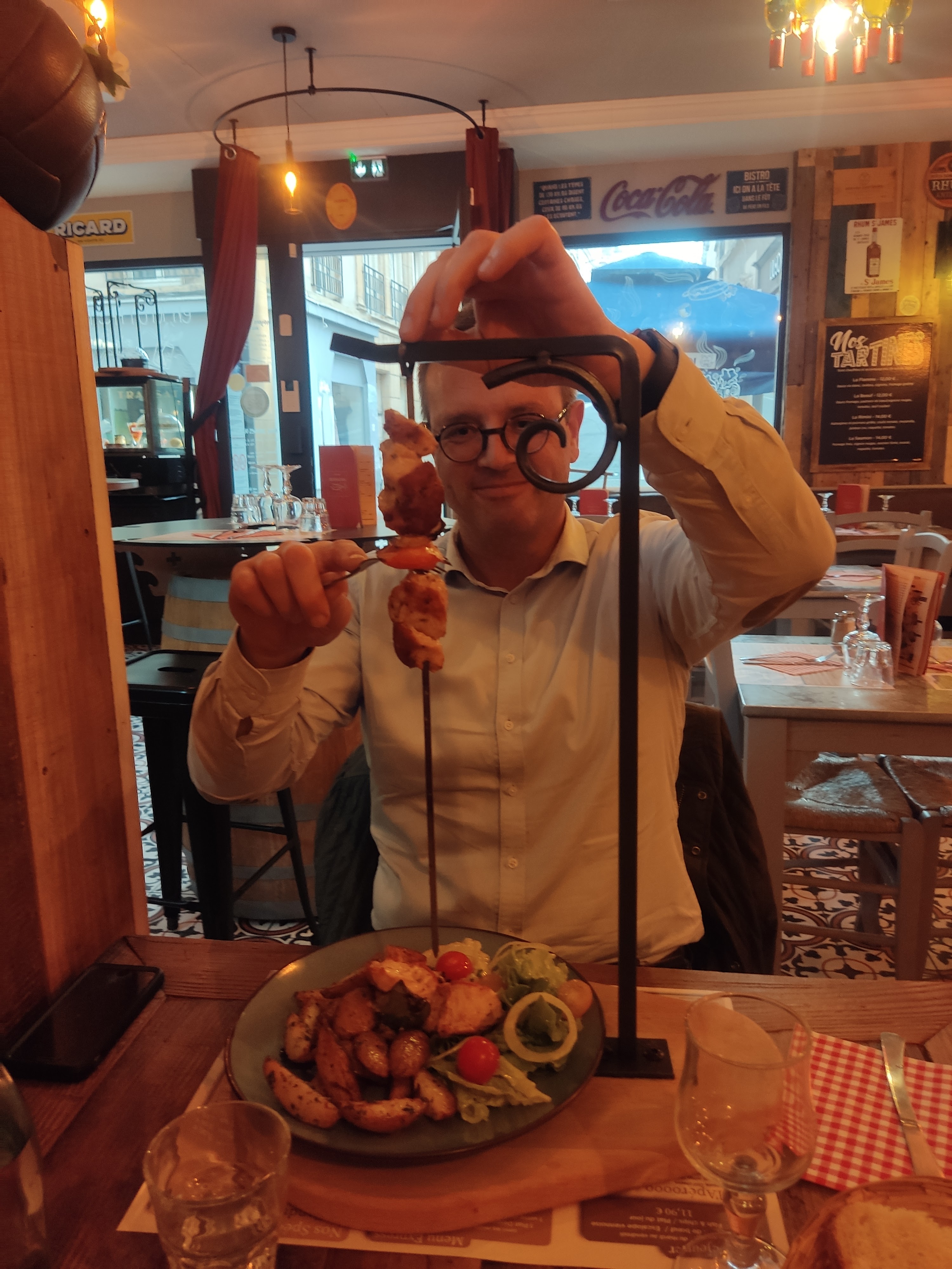 Plats corrects et copieux, service sympa et ambiance atypique. Bravo, sympa pour un repas entre amis 👍 Belles brochettes, etc.