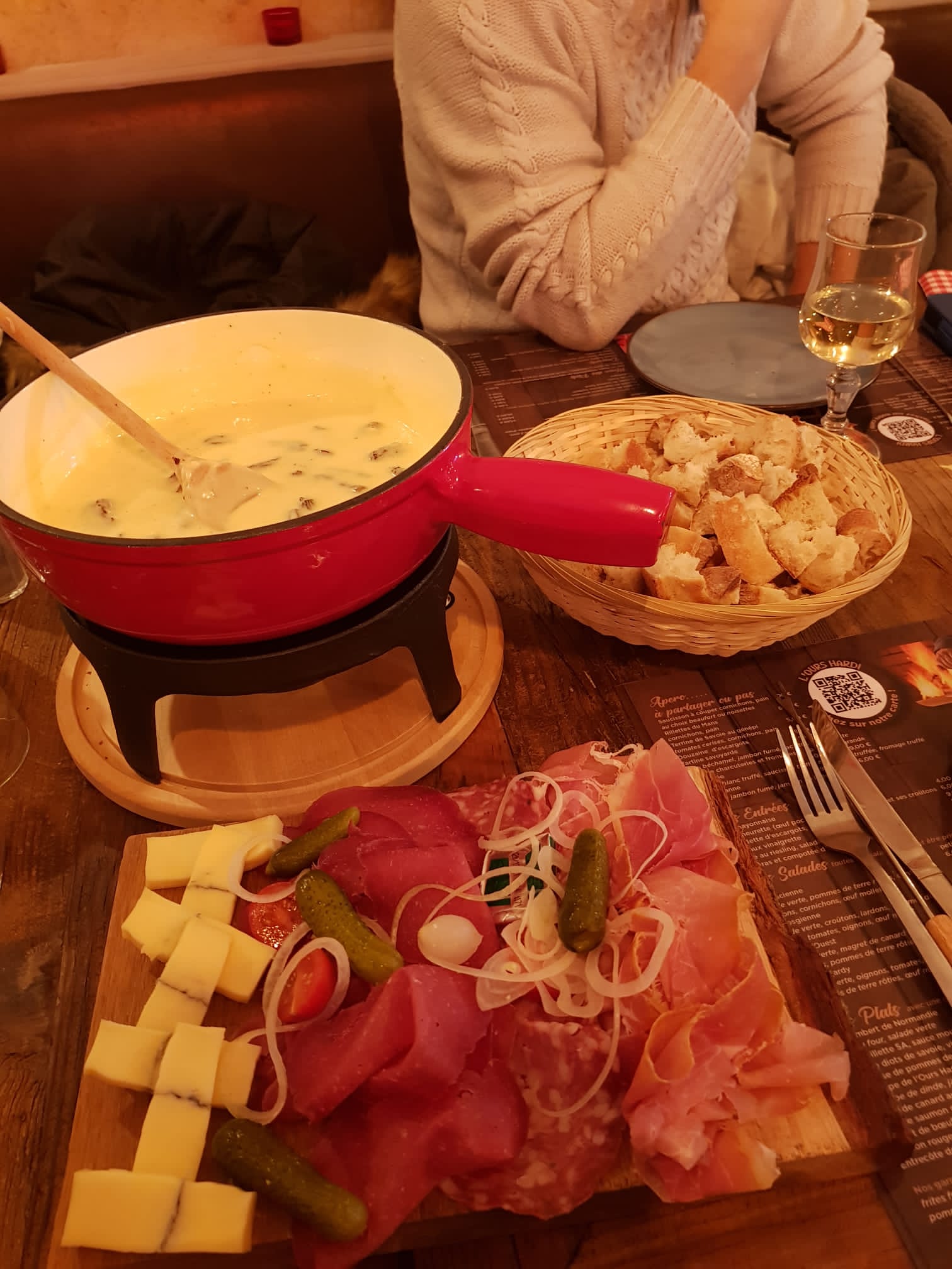 Pour les amateurs de fromage c’est le bon endroit, pour ceux qu’il le sont un peu moins il y a toujours des salades, des tatares, des brochettes et j’en passe ! Manger autour d’un tonneau , un bon moment de convivialité !! À y aller sans hésiter !! Merci à ce restaurant pour leur accueil !!!