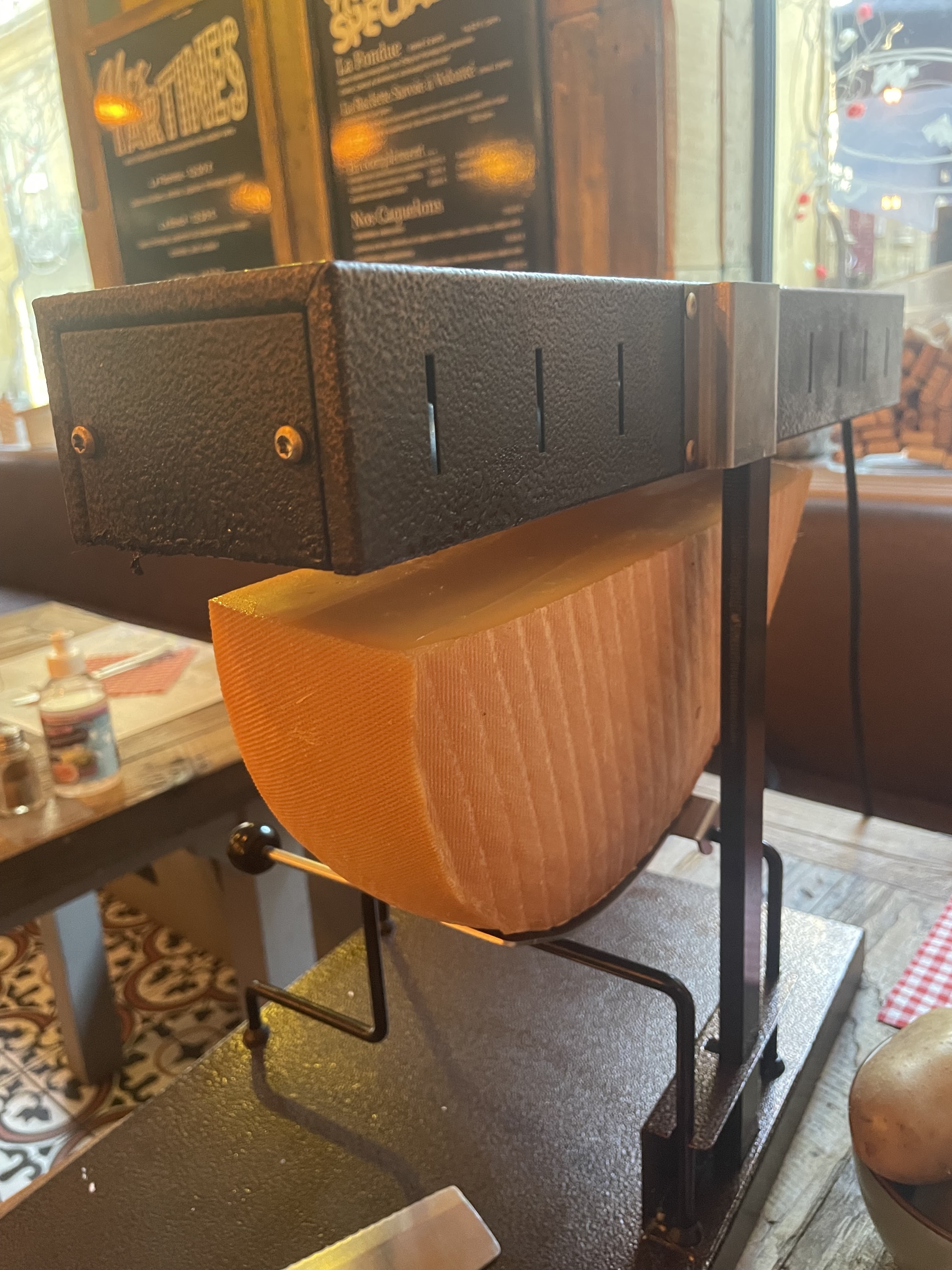Les tables sont très petites. Difficile d'y loger l'appareil à raclette avec une demie-meule de fromage. Celui situé près de l'appareil risque la surchauffe. Fromages de qualité