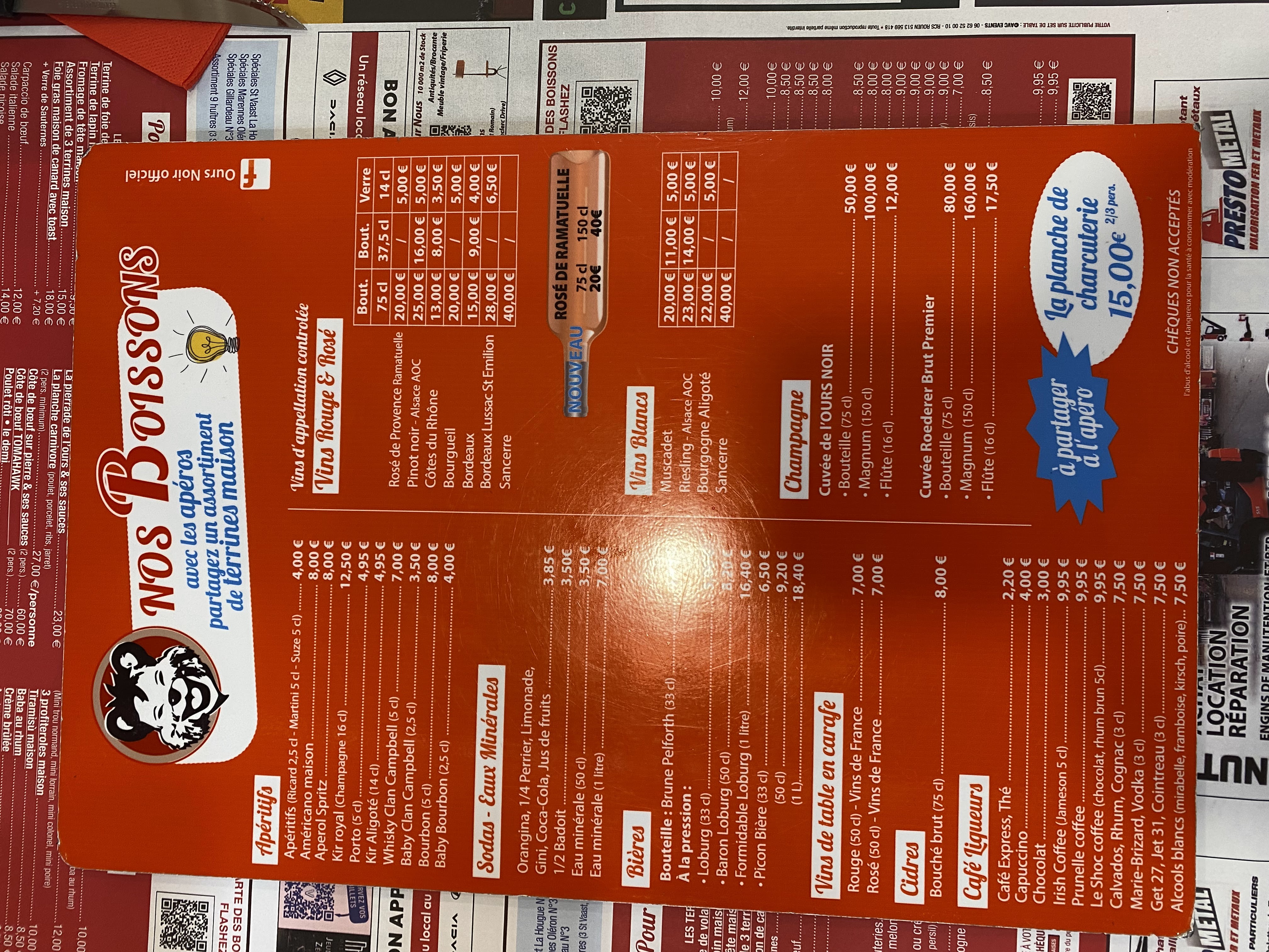 Nous avons pris une planche frites Une cuisses de poulet et jarret ! 27 euros mais x 2 en plus vraiment pas bon ! A part les frites Une arnaque rien de correct Attention regardez bien la carte fête des loges st germain en laye