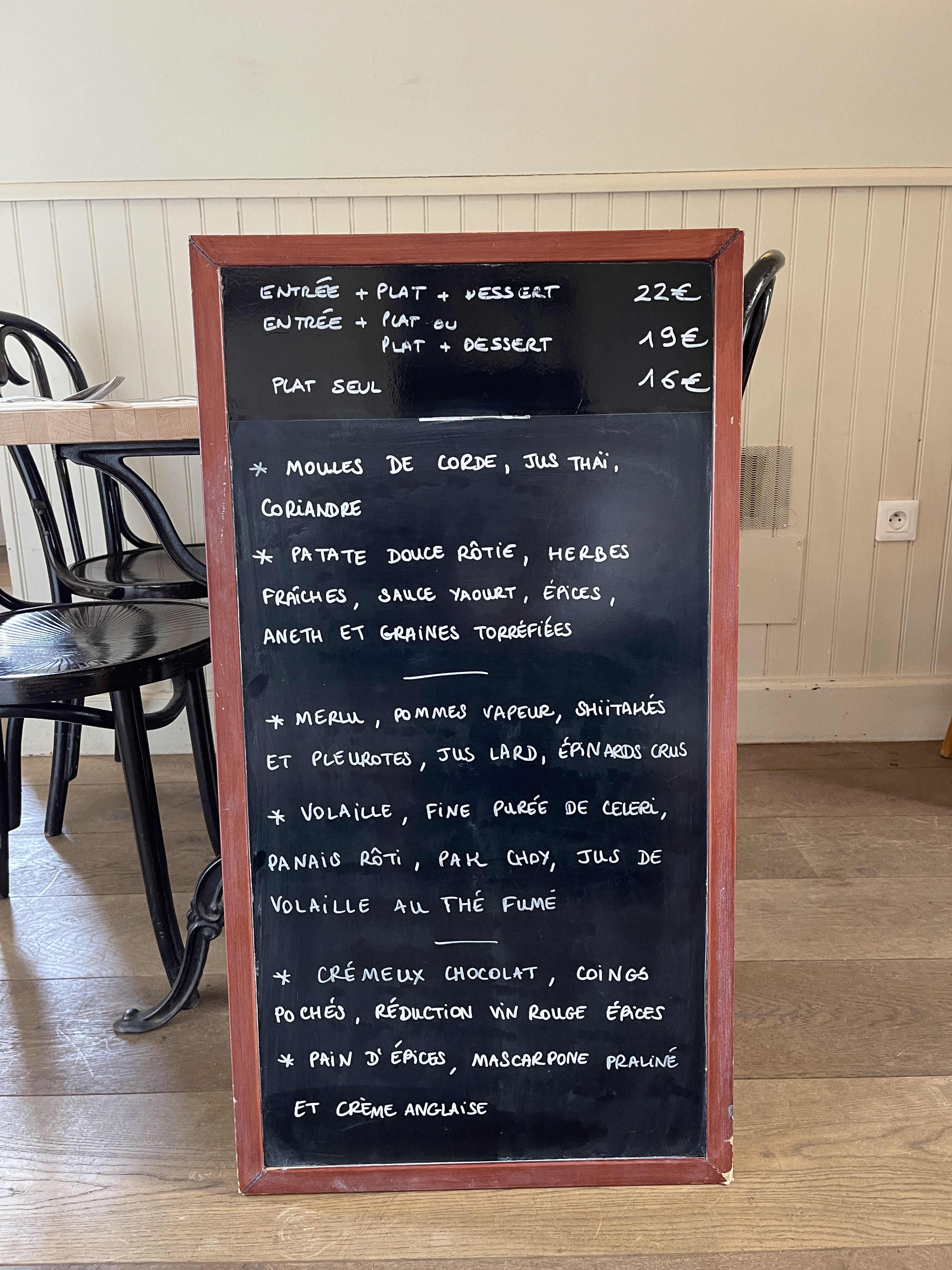 Ambiance cosy sympa Carte un peu trop minimaliste (seulement 2 plats et 2 desserts) Plats très bons avec saveurs originales, mais quantités un peu trop faibles.