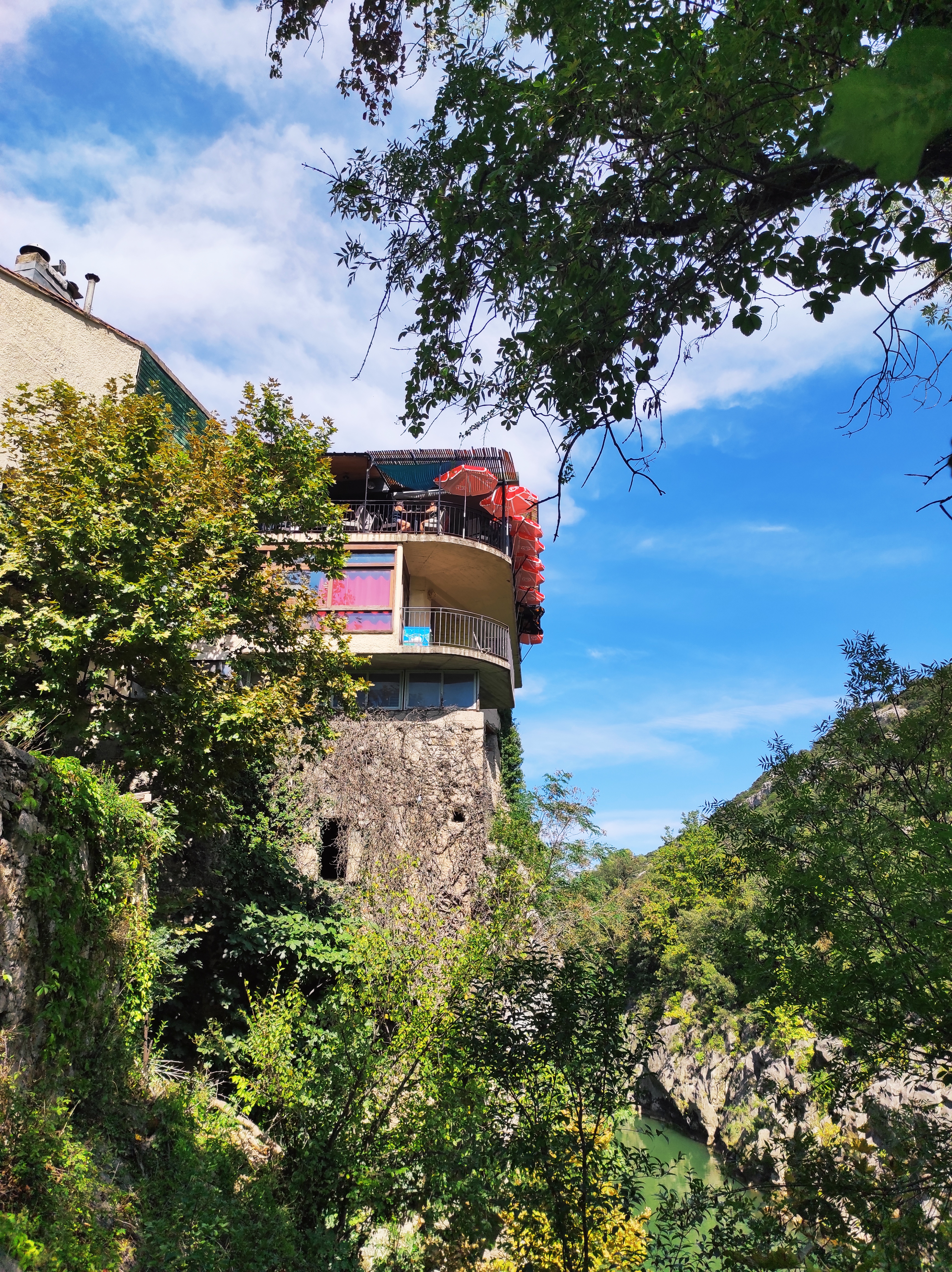 Quel surprise en entrant dans ce lieu atypique avec une salle sur une terrasse surplombant les gorges de l'Hérault, très bonne cuisine et point de vue impressionnant, je vois le conseil vivement si vous faite escale à Saint Guilhem le désert