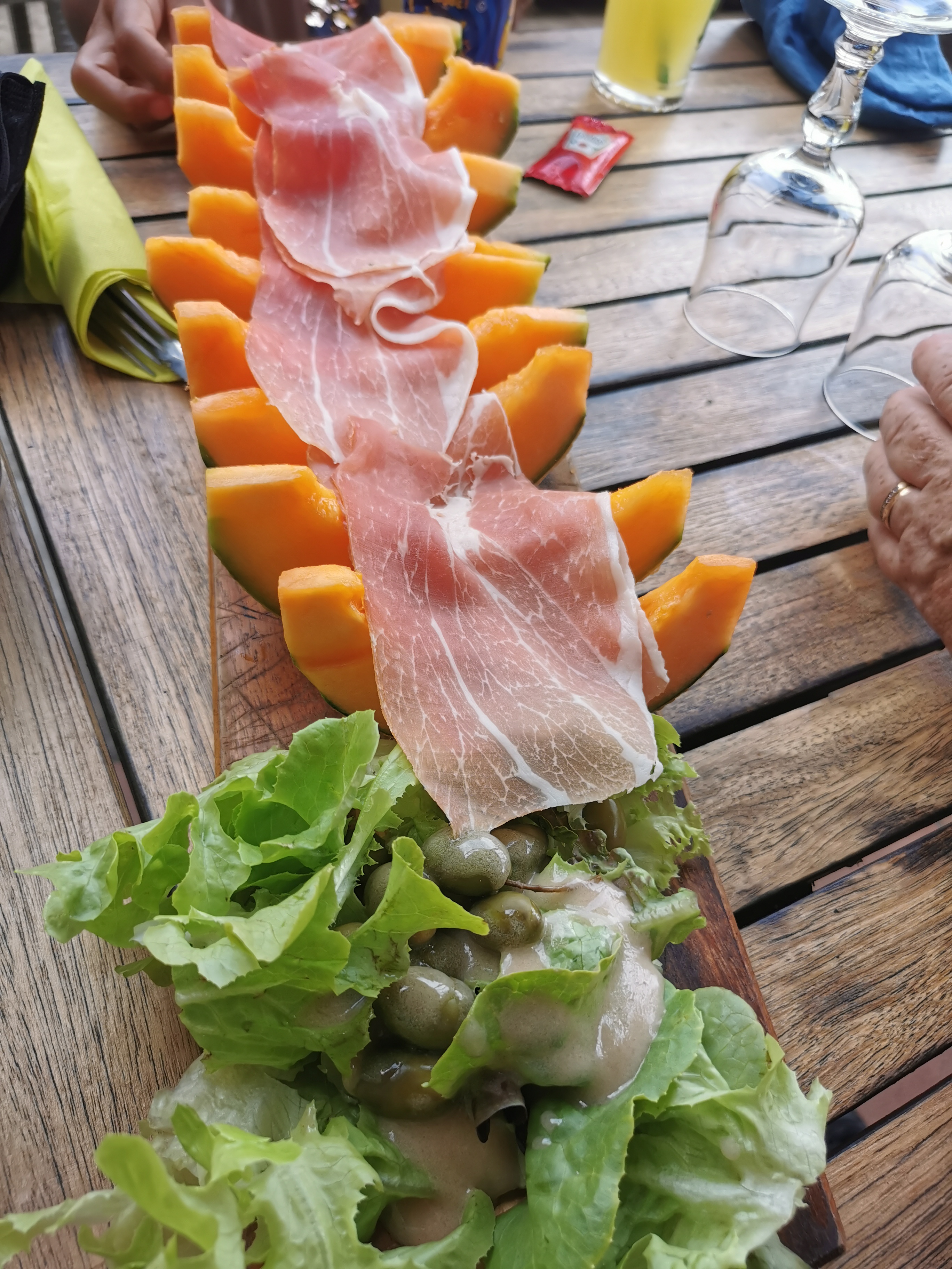 Accueil très sympa par le patron et les serveurs. Les assiettes sont très copieuses, le goût est au RDV. Et le top : une belle vue depuis la terrasse! Sur les photos l’assiette de melon avec jambon ( a partager ou en plat) et saumon au pesto.
