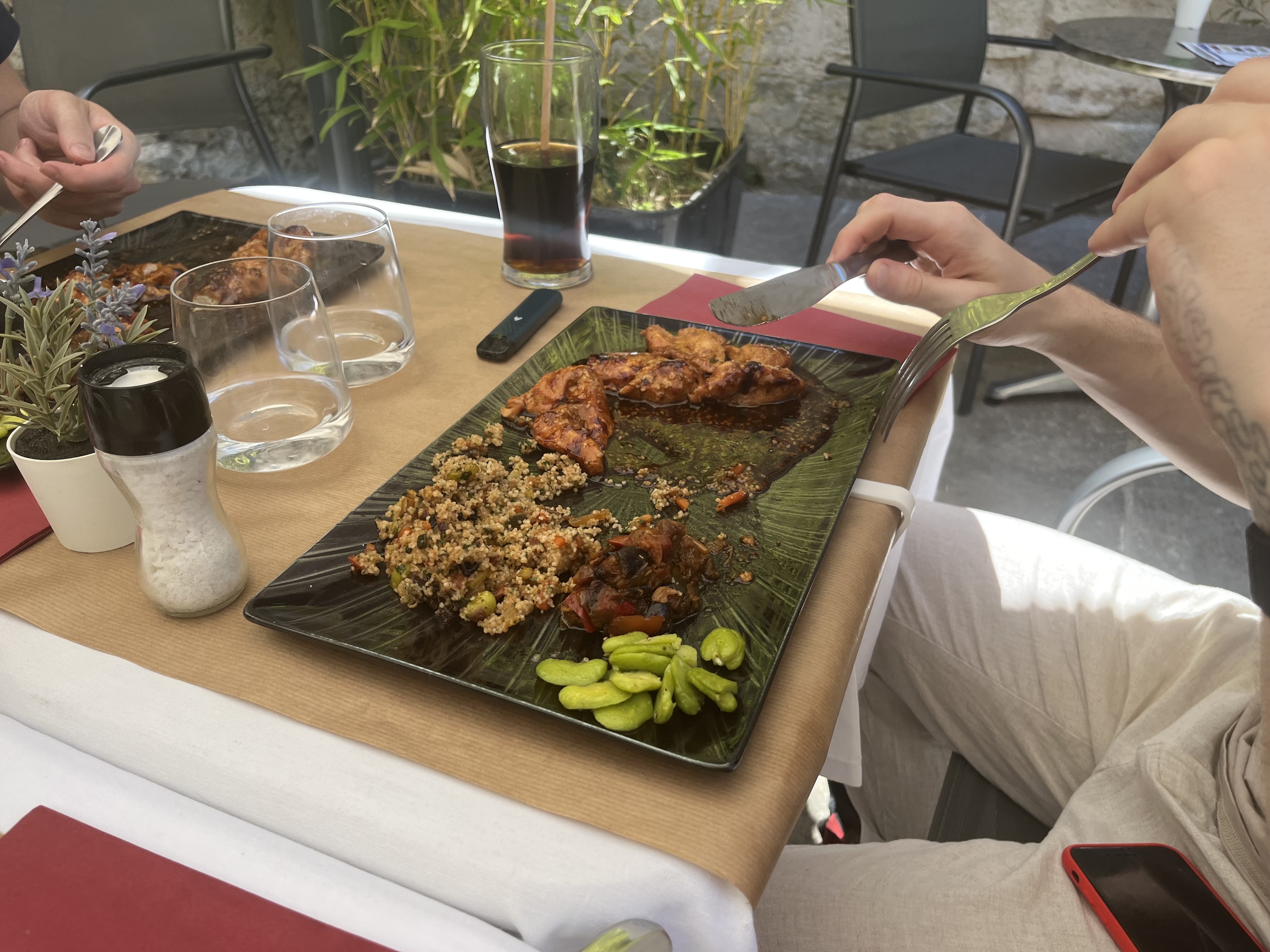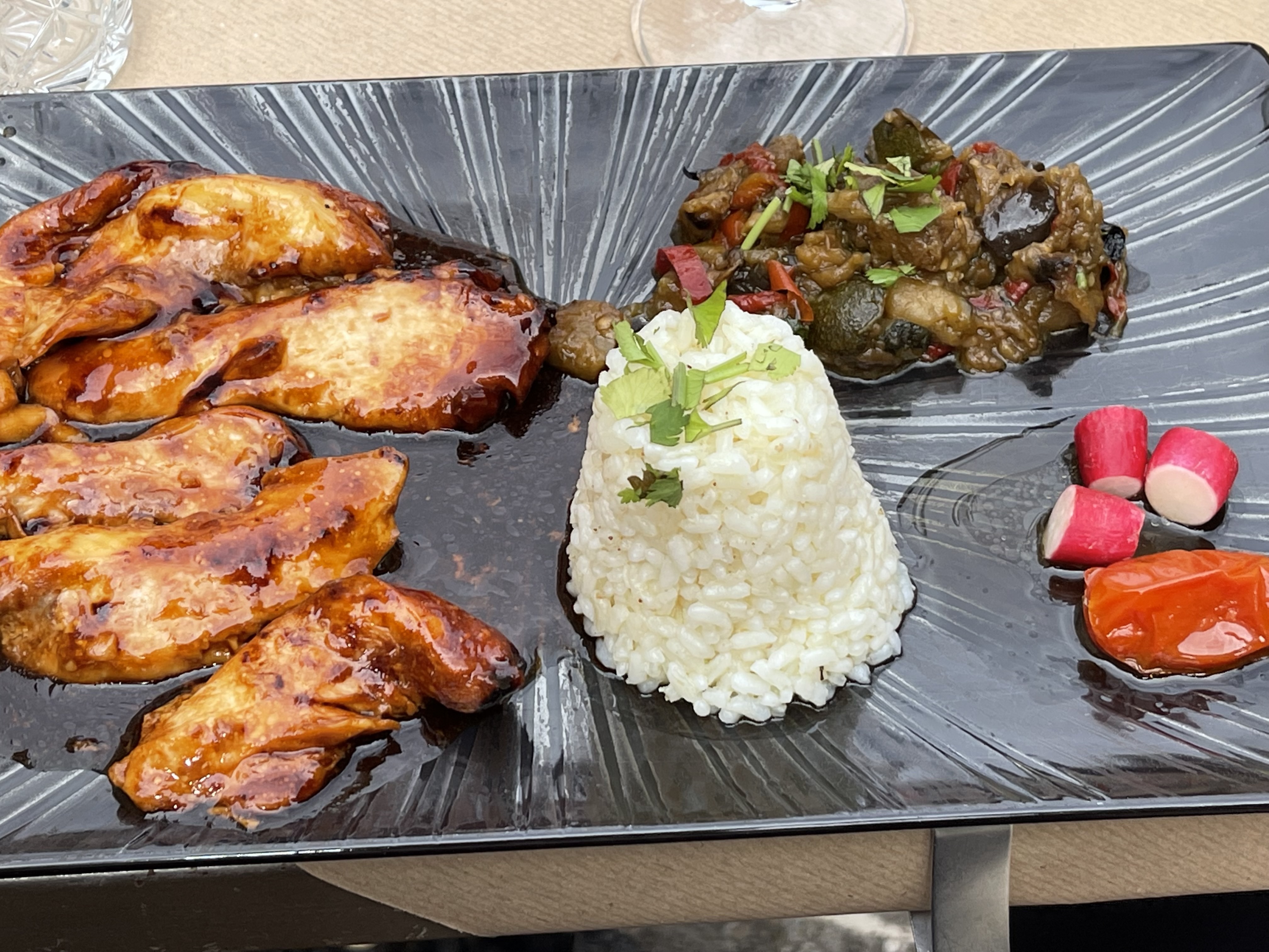 Chouette resto en terrasse au soleil, nous nous sommes régalés ! Brochettes de poulet, rôti de bar et carpaccio de boeuf. Le serveur très gentil nous a même renseigné sur les carrières des lumières.