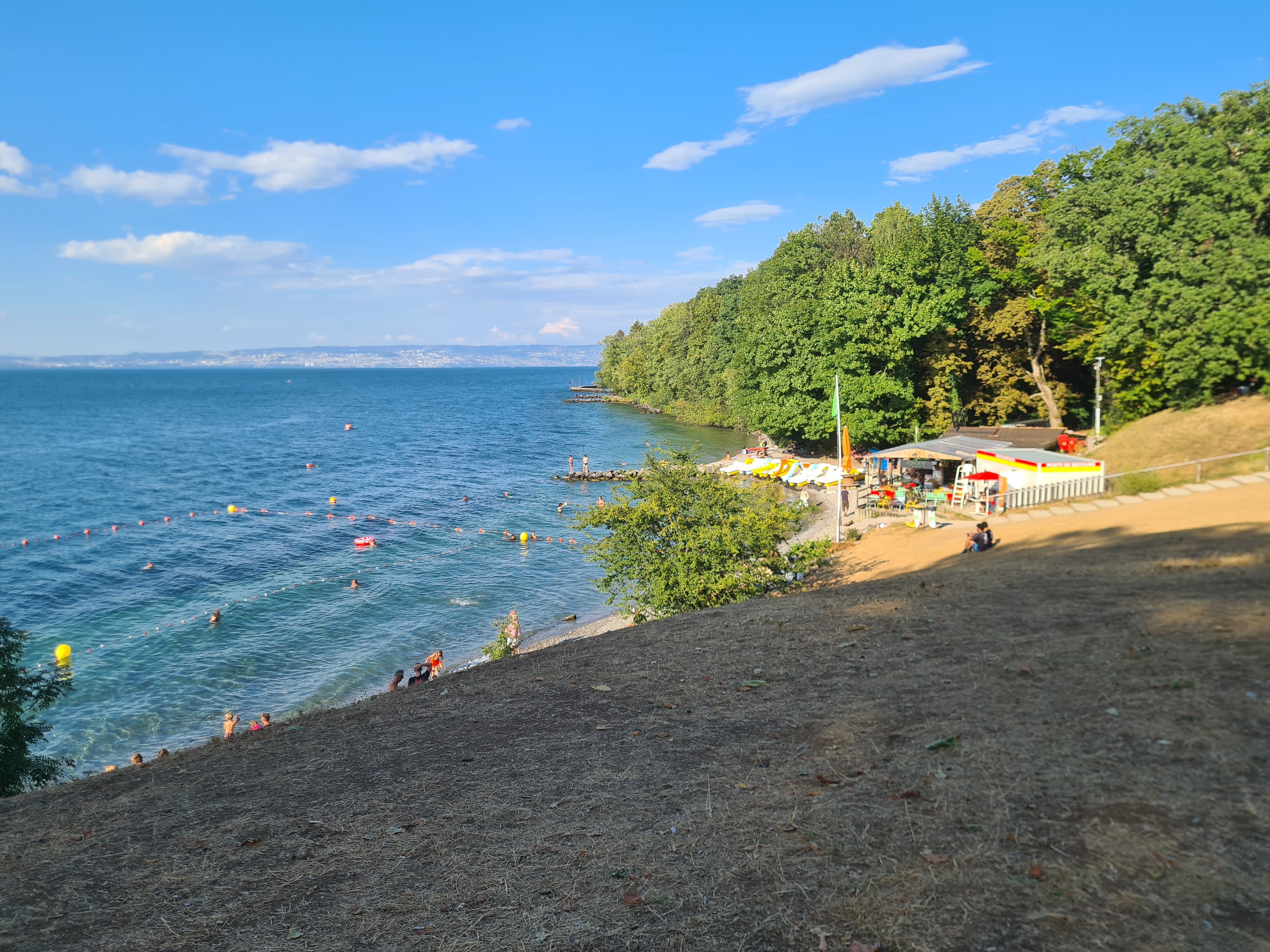 Toujours notre endroit préféré pour manger au bord du lac Léman. C'est de la bonne nourriture, un service amical et une ambiance de plage, l'endroit idéal pour se détendre après une semaine bien remplie. Si vous êtes assez chanceux, vous serez accueilli par un homme torse nu ;) Roald, Janet, Vikki et Ross