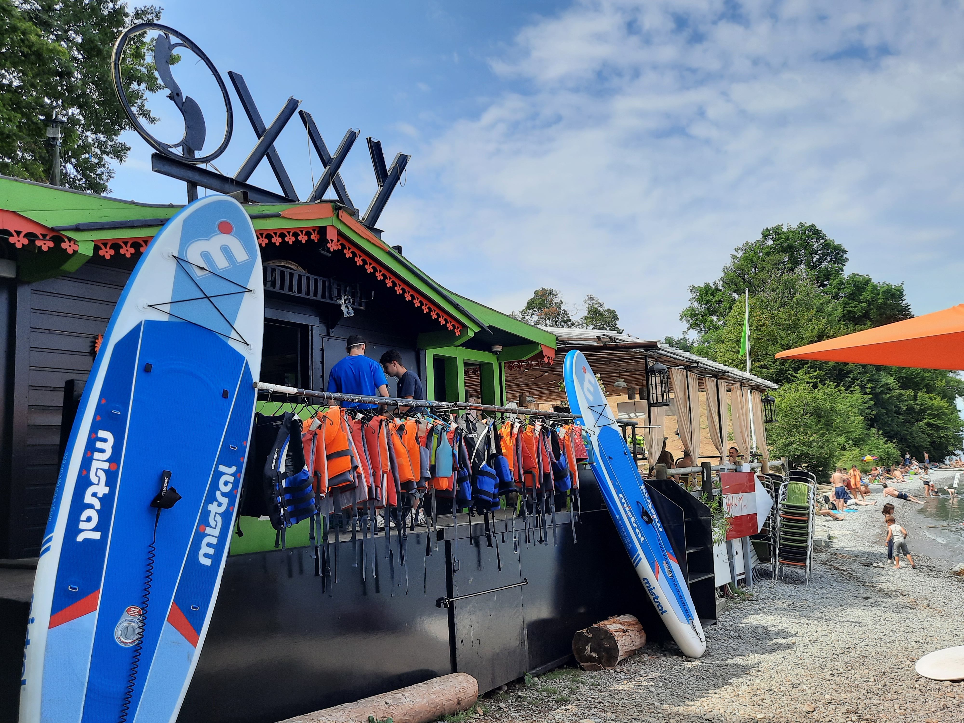 Établissement disposant d'une plage attenante, proposant de paddles, pédalos, pour aller sur la Lac. Très belle vue sur le Lac. Ne prenant pas la carte de credit, cependant large choix de boissons fraîches et de rafraîchissement ( Glaces) Je recommande vivement cet endroit.
