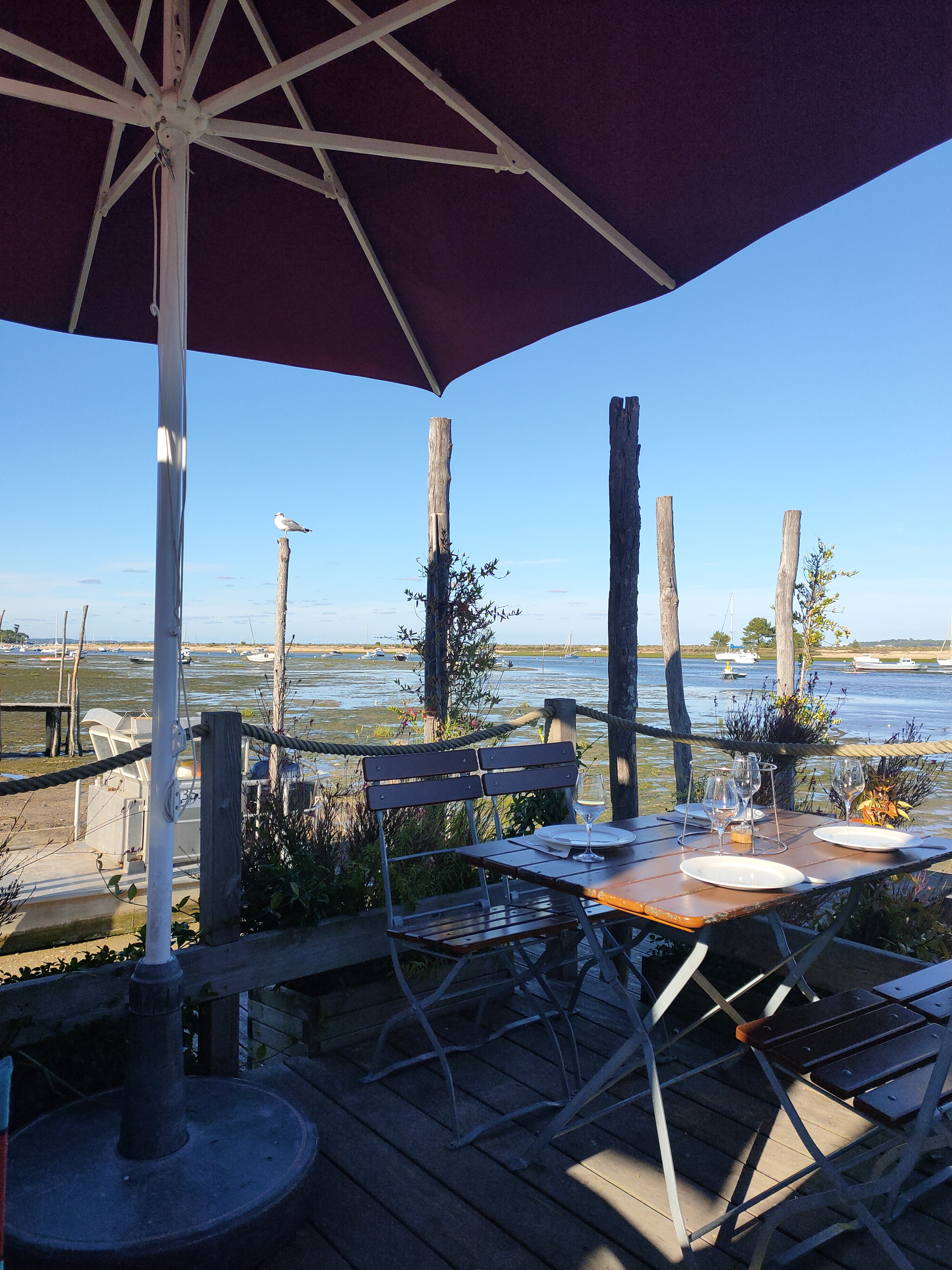 Très belle vue depuis une terrasse élégamment meublée directement dans la baie. Et des huîtres très savoureuses.