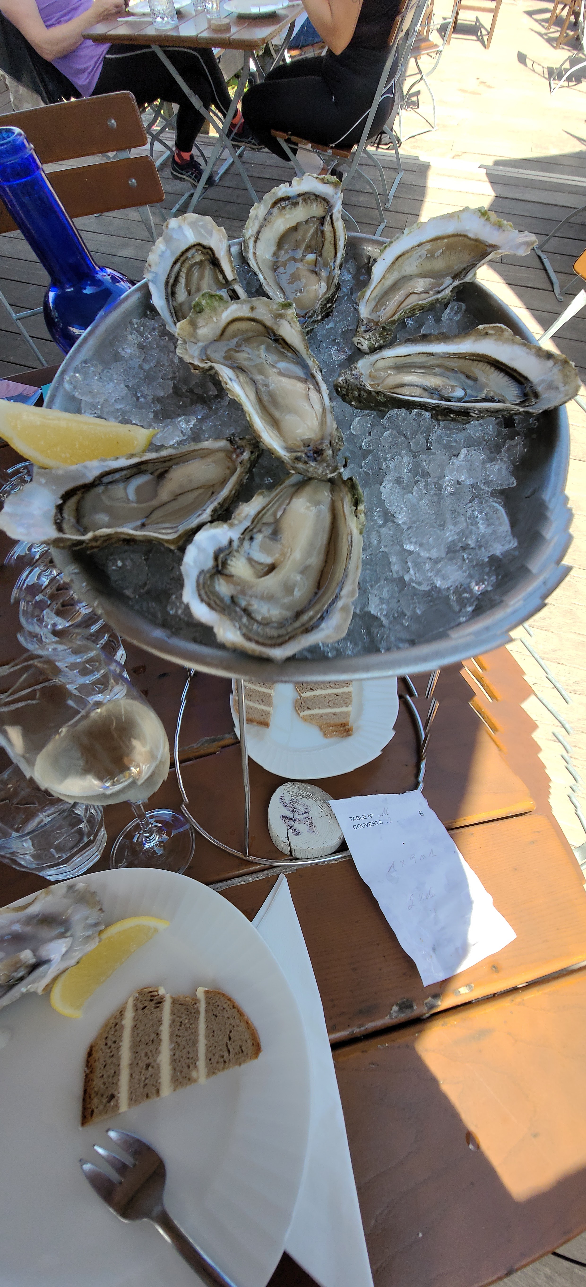 De l'authentique et juste ça ! Des huîtres merveilleuses et un pain garni de beurre entre les couches. ..et le vin bio fabuleux