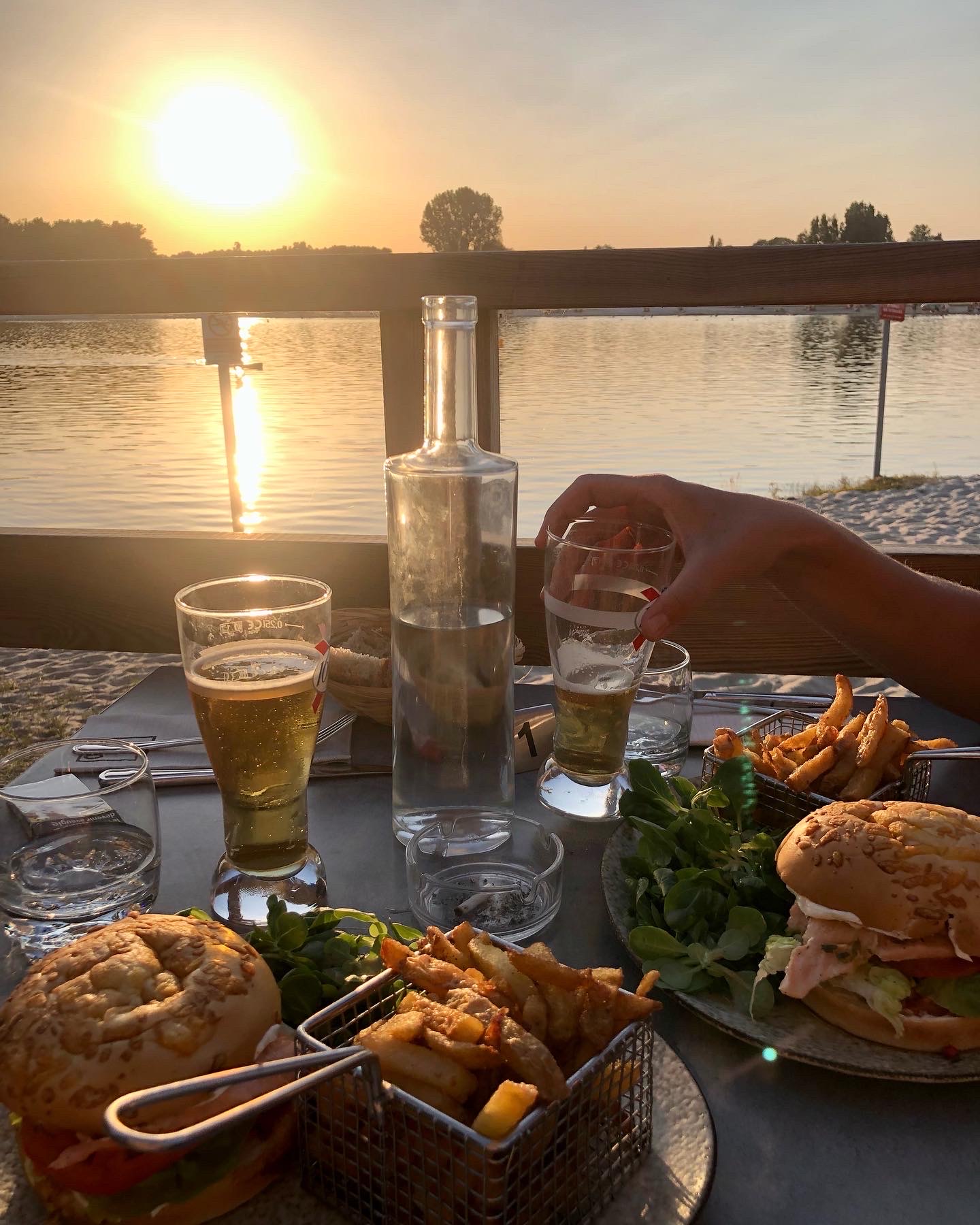 Le restaurant est situé juste au bord du lac. Vous dînez à la plage avec un coucher de soleil spectaculaire. Le service est rapide, serviable et sympathique. Pour la meilleure table, je vous recommande d'appeler et de réserver. Cela vaut le coup pour une soirée absolument parfaite. Leur vin blanc au verre est très fruité et accompagne très bien leurs fruits de mer. La salade au fromage de chèvre est servie avec une savoureuse vinaigrette. Le jarret d'agneau est aussi tendre que possible et délicieux. Les gambas sont grosses et juteuses. Je donne un petit point négatif pour les frites qui pourraient être plus croustillantes mais elles restent délicieuses. Les desserts ne sont aussi qu'un rêve. Le gâteau aux amandes n'est pas sec et se marie parfaitement avec la glace vanille. La Coupe Marrakech se compose de jus d'orange, de glace et de chantilly. Boire à travers les trois couches avec la paille rend la soirée enfin parfaitement soignée.