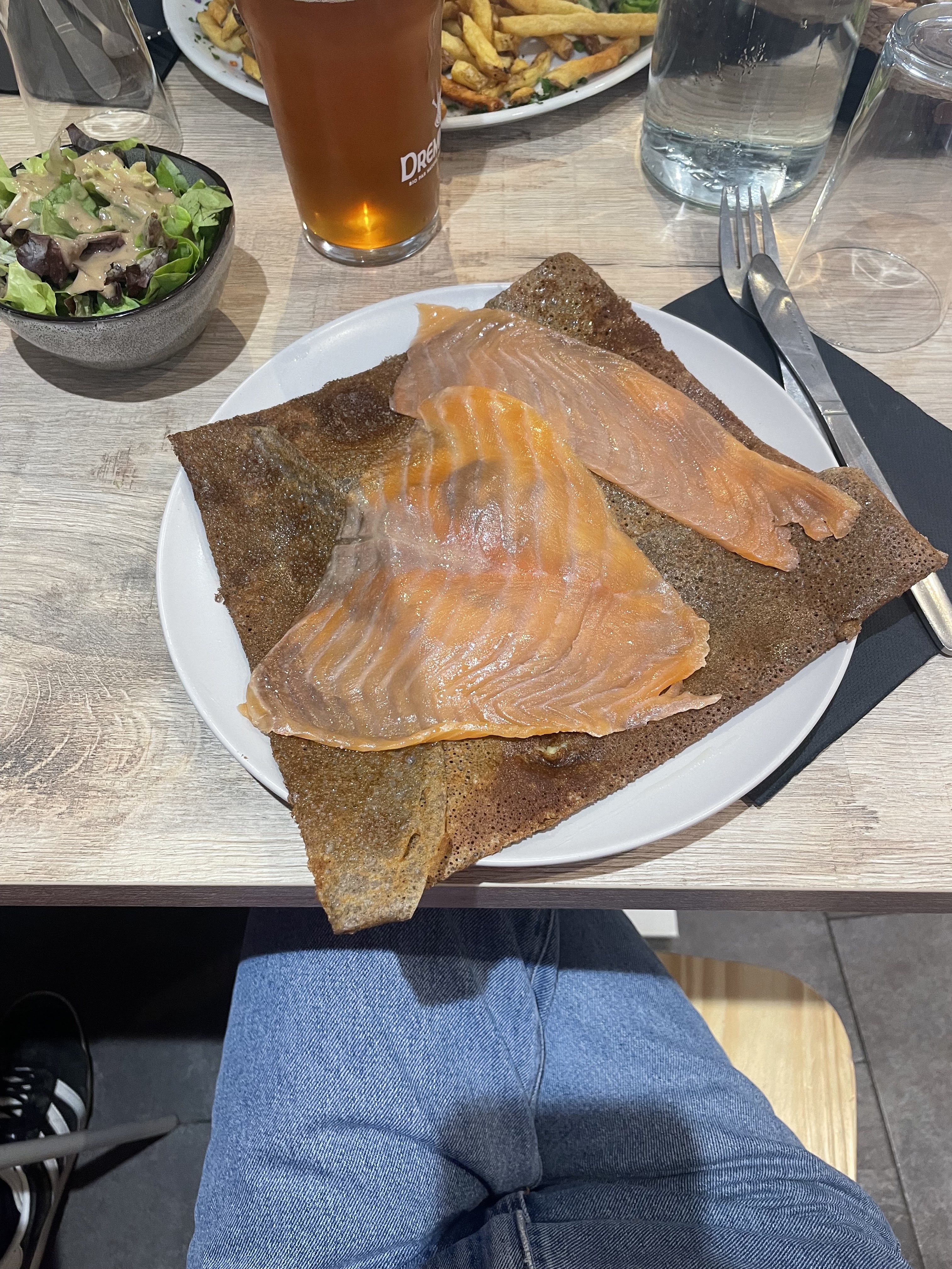 On s’est vraiment régalés ! 😋 Les galettes et crêpes étaient gourmandes et délicieuses. On a aussi aperçu le fish&chips et les frites qui avaient l’air super bons. La déco est soignée. La terrasse abritée est très agréable et le service avec le sourire. Bref, on recommande +++ et on reviendra avec plaisir.