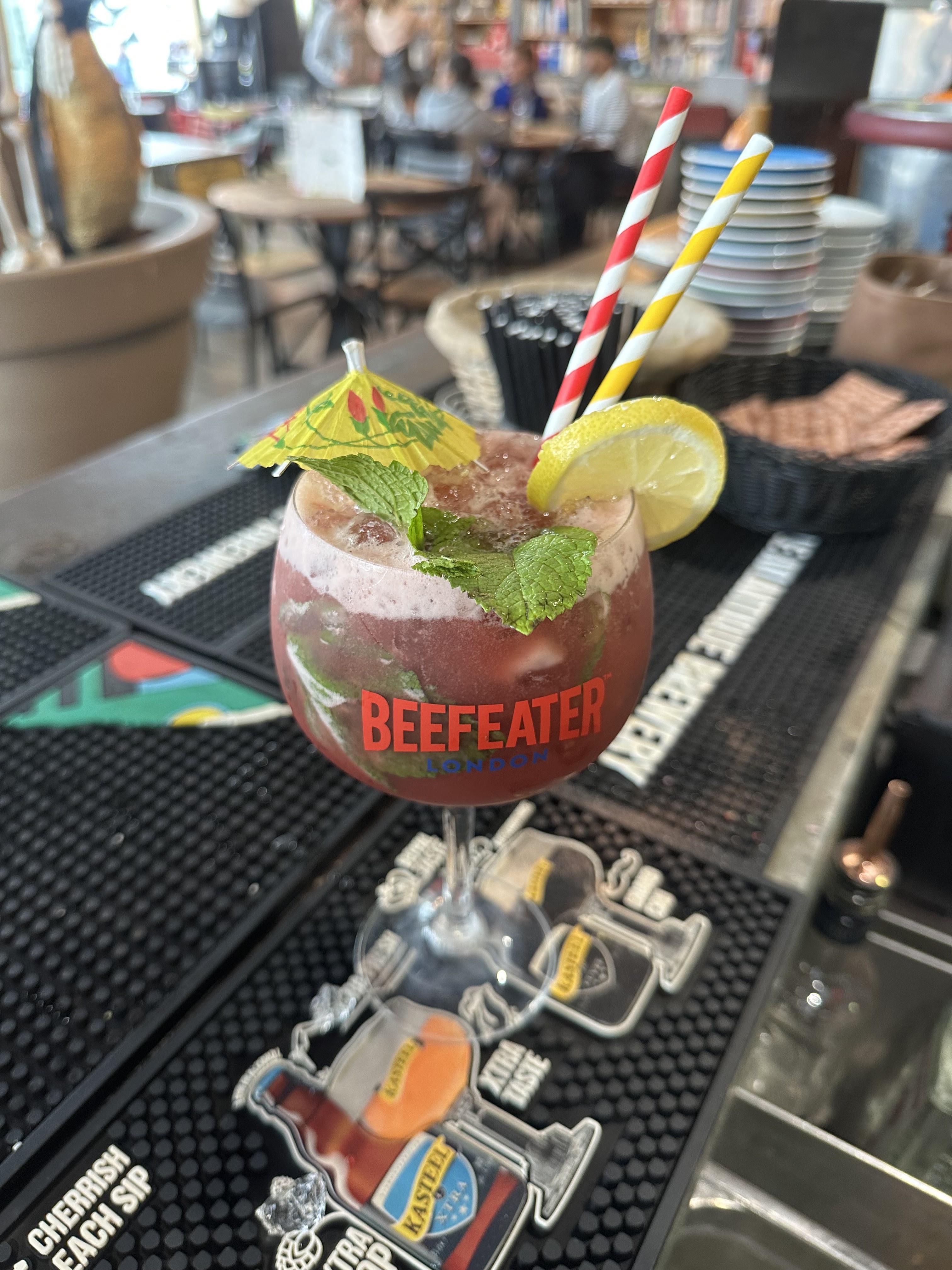Bel endroit pour un apéritif/bière/cocktails Pas aussi propre que prévu pendant une période de faible trafic. Ambiance, comme un centre commercial.