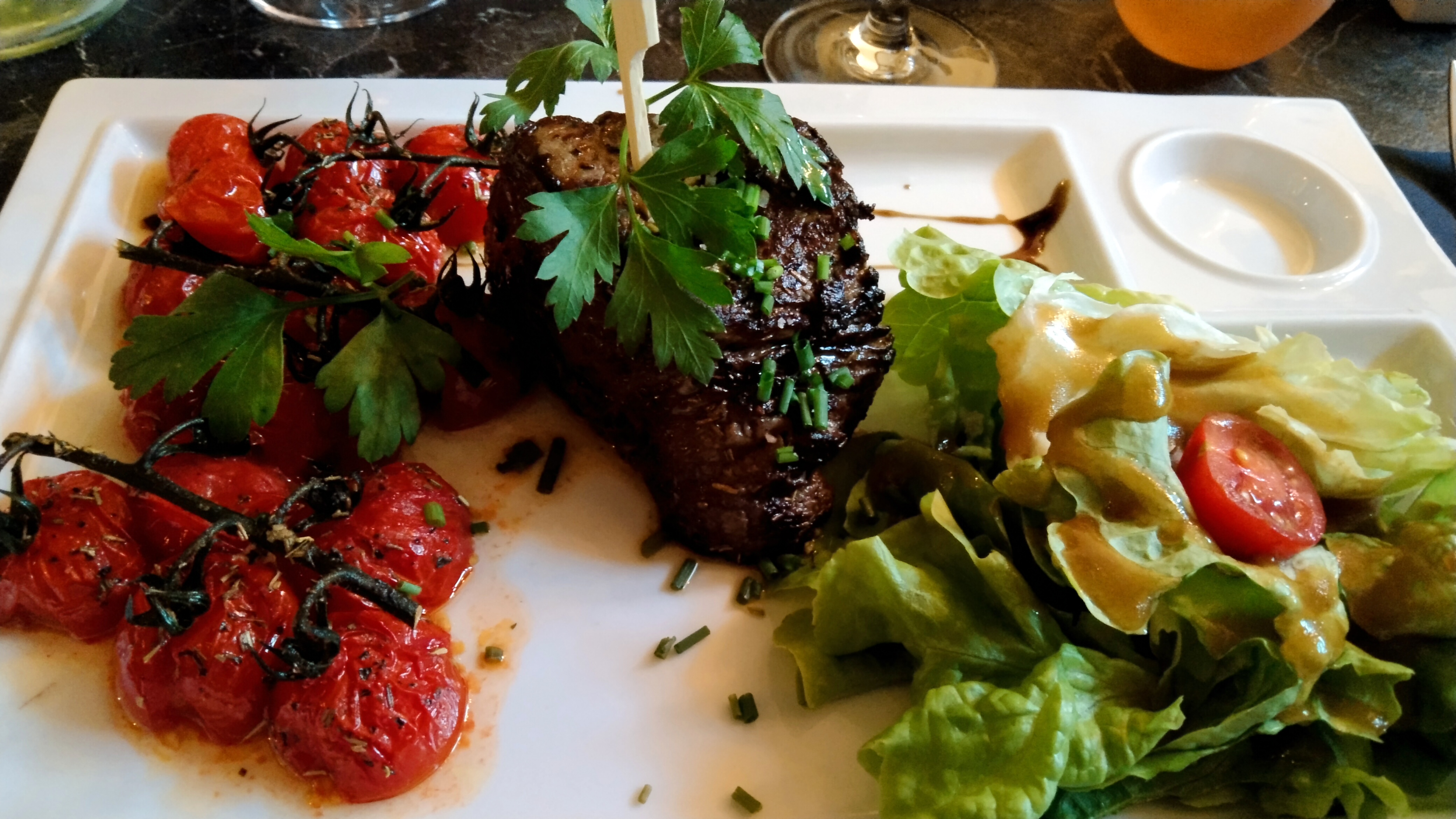 Repas le midi, c’était excellent, j'avais pris une viande cuite en poêle devant nous avec une sauce foie gras. Un peu cher mais la viande était parfaite. Je recommande