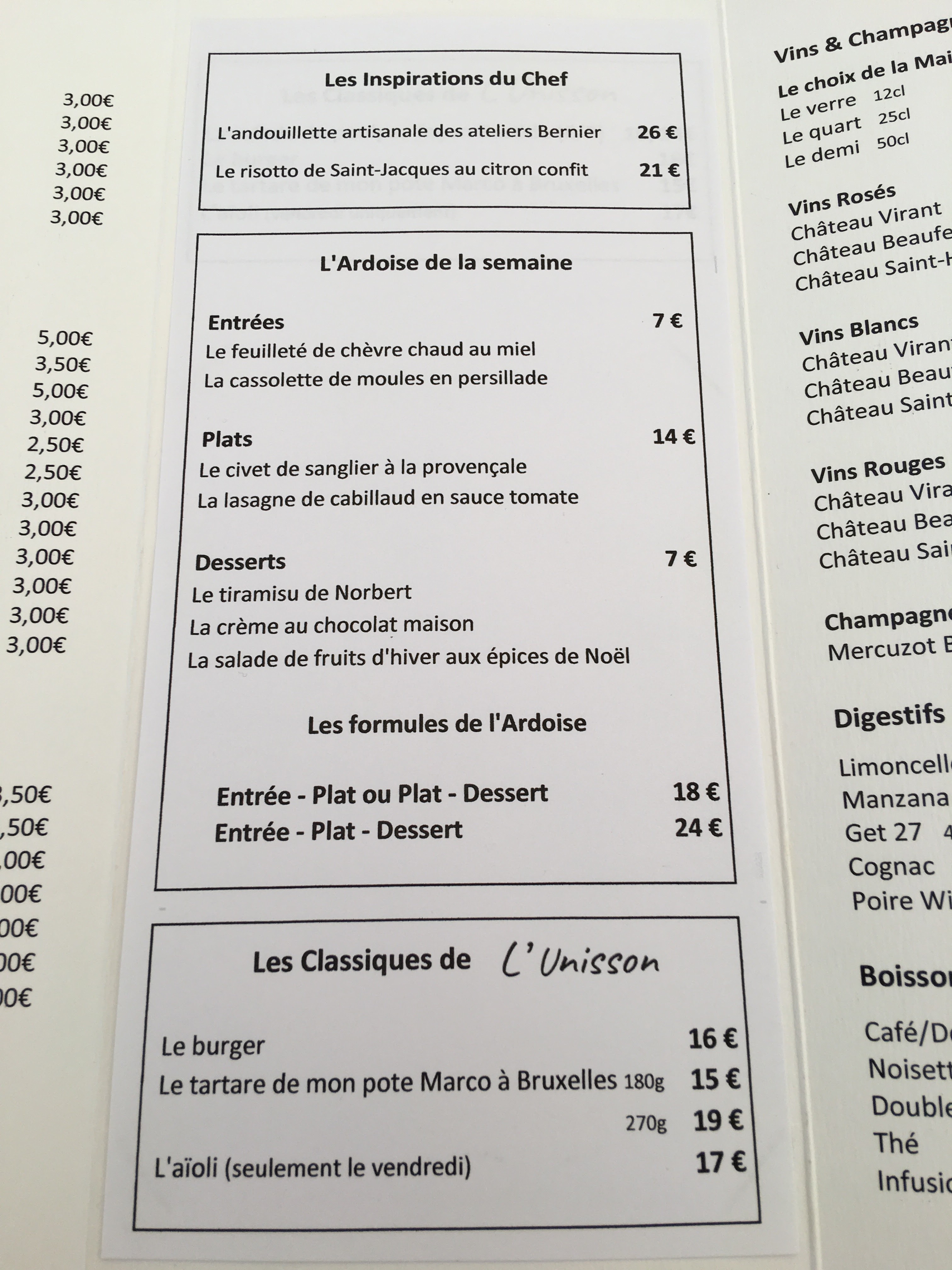 3 entrées, 3 plats, 3 desserts + plat du jour (en l'occurrence aujourd'hui vendredi, c l'aïoli!) simple, bon , efficace et un service très sympathique ! Terrasse très agréable. Je recommande.