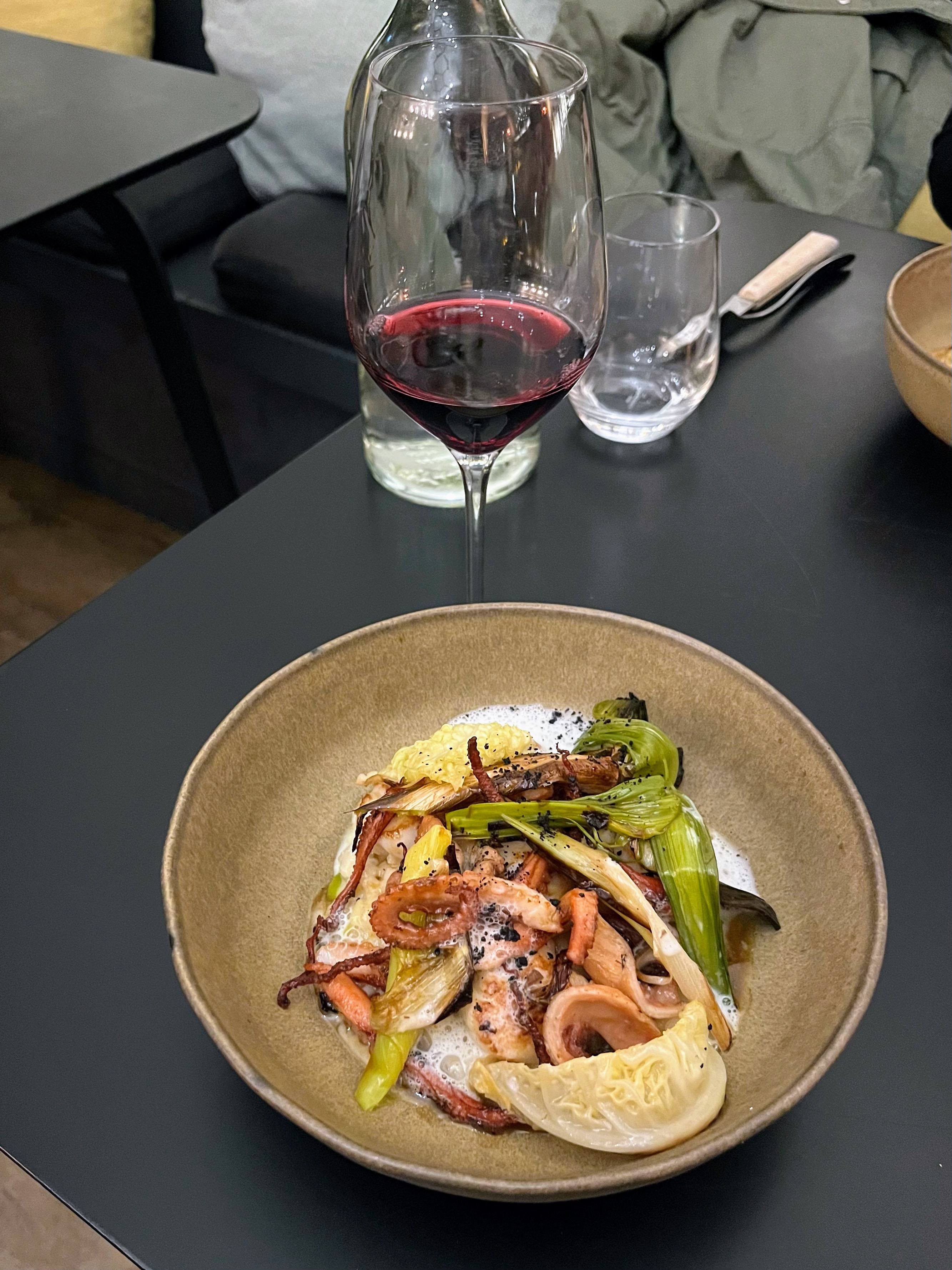 Un bon restaurant local si proche de notre hôtel. Les conseils sur le vin étaient parfaits. Nous avons pris un excellent Pessac-:Léognon. Le plat principal, un risotto au poisson et aux légumes, semblait ordinaire, mais il avait un goût savoureux particulier. Le service était fluide et informel. cela formait un bon ensemble avec l'espace et le menu.