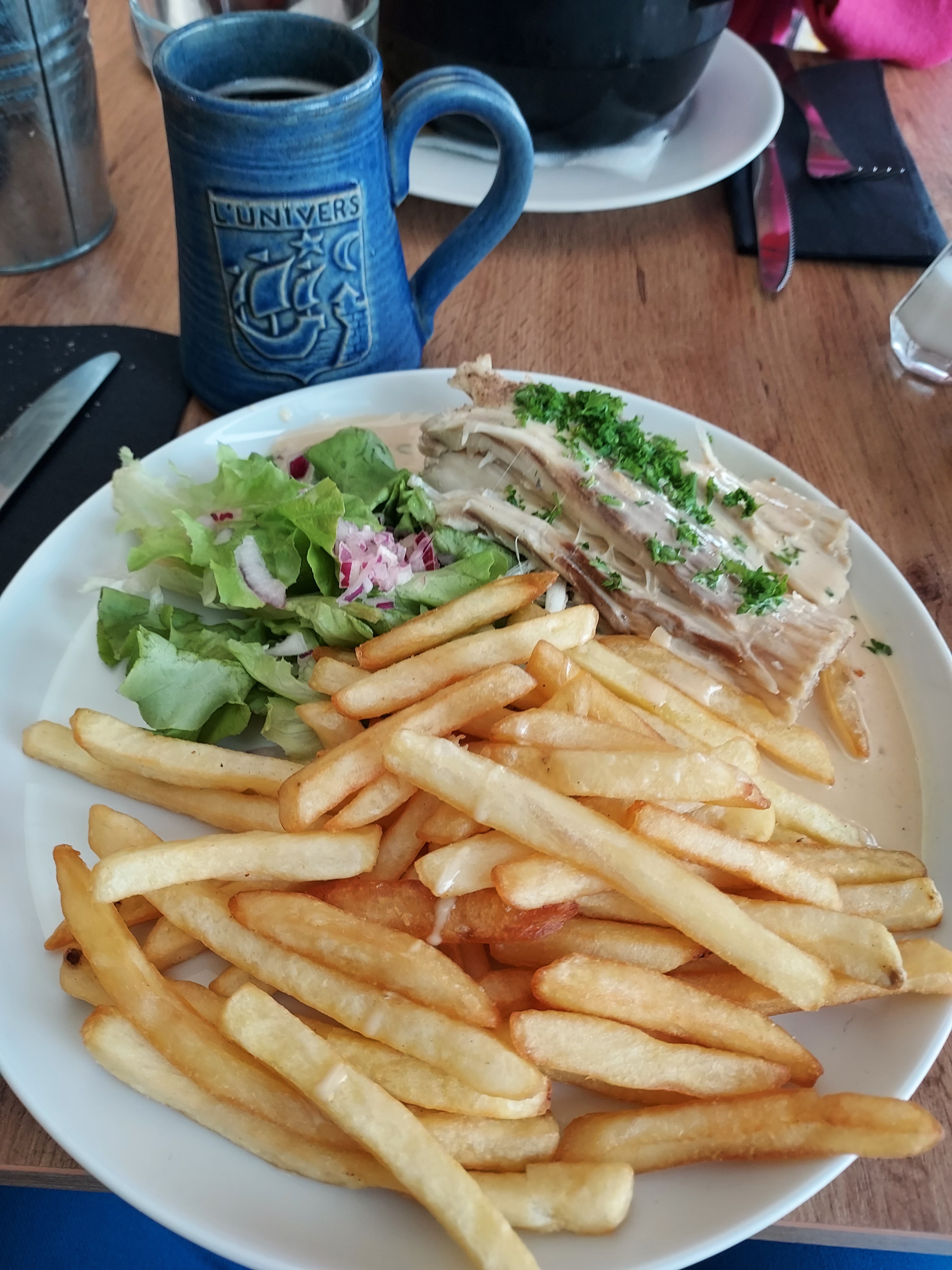 L'entrée de fruits de mer était insipide, du surgelé agrémenté de sel et d'un peu de persil. Dans les moules, oignons également surgelés. Pour la raie, elle était accompagnée de frites, du riz aurait été plus adapté avec la sauce à base de crème fraîche. Le service est long, j'ai dû réclamer un pichet d'eau à 4 reprises. C'était la 1ère fois, et ce sera la dernière fois que nous déjeunerons dans ce lieu.