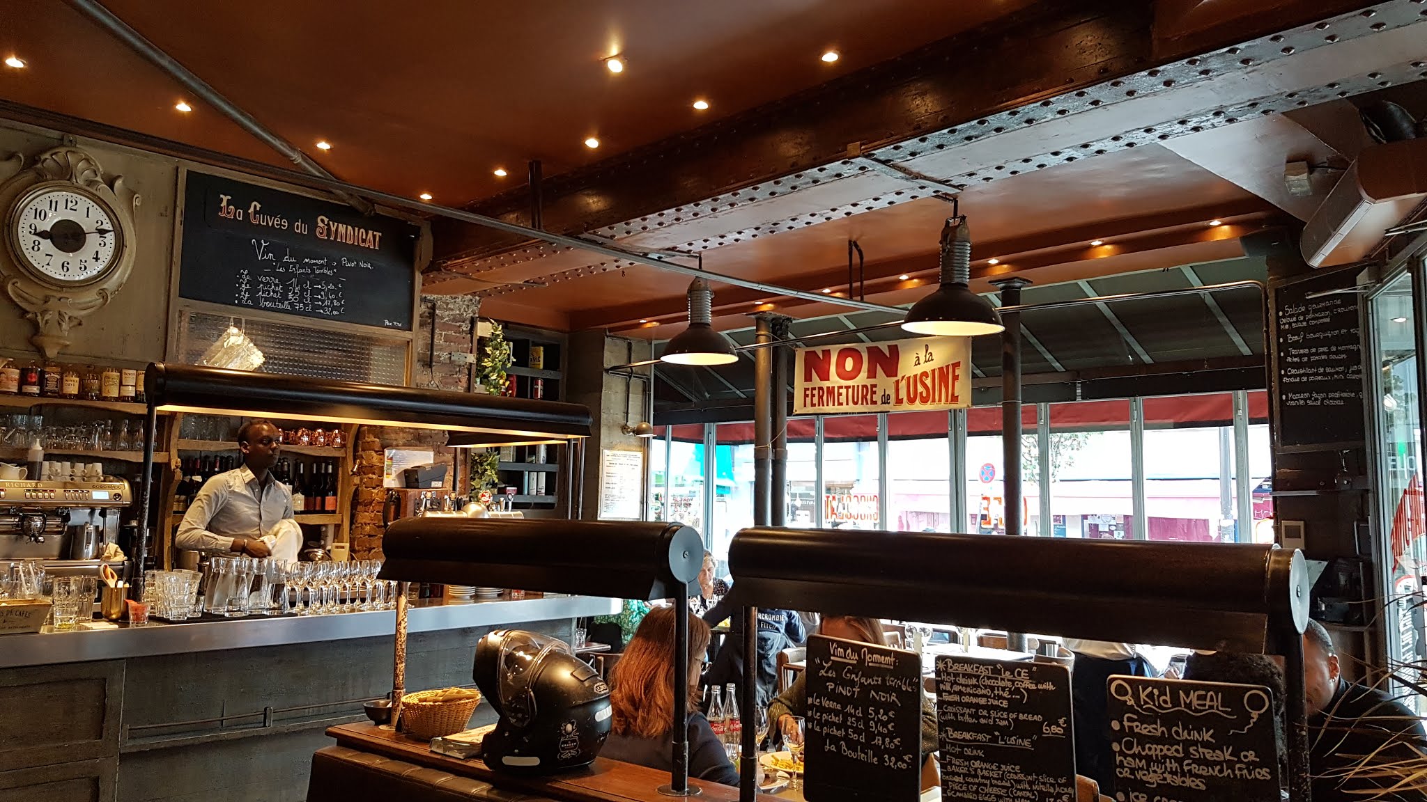 J'y étais pour un dîner à 2 un jeudi soir. Le serveur a tres bien fait le travail. La cuisine était aussi très bonne. Et le restaurant a une decoration qui est un mélange de brasserie chic avec un thème usine industrielle. Vins, plats et desserts pour 60 euros pour 2.