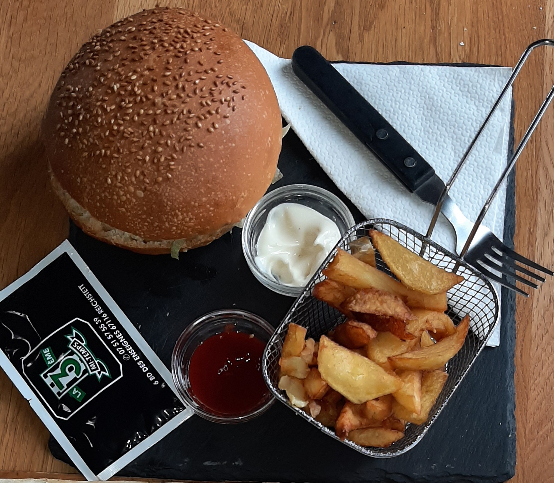 Burger frites, tout est fait maison a un prix défiant toute concurrence. L'équipe est adorable. Je recommande les yeux fermés. Continuez ainsi 🙏