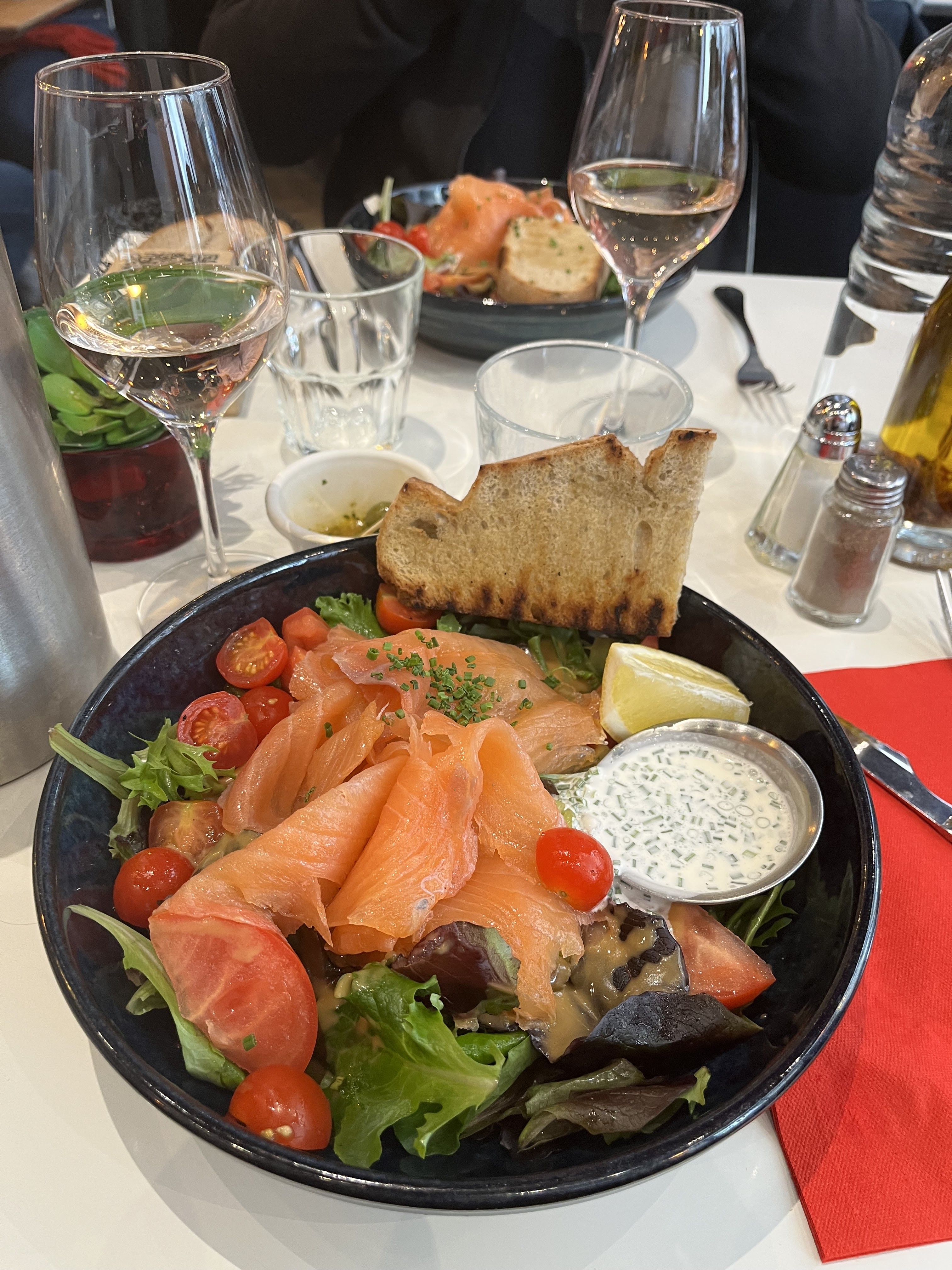 Salade césar sans sauce. Salade saumon maigrichonne avec surtout de la verdure. Rédhibitoire, pas de carte pour le menu, que le QR code. Nous n'avons pas apprécié. Serveur jeunot et peu agréable.