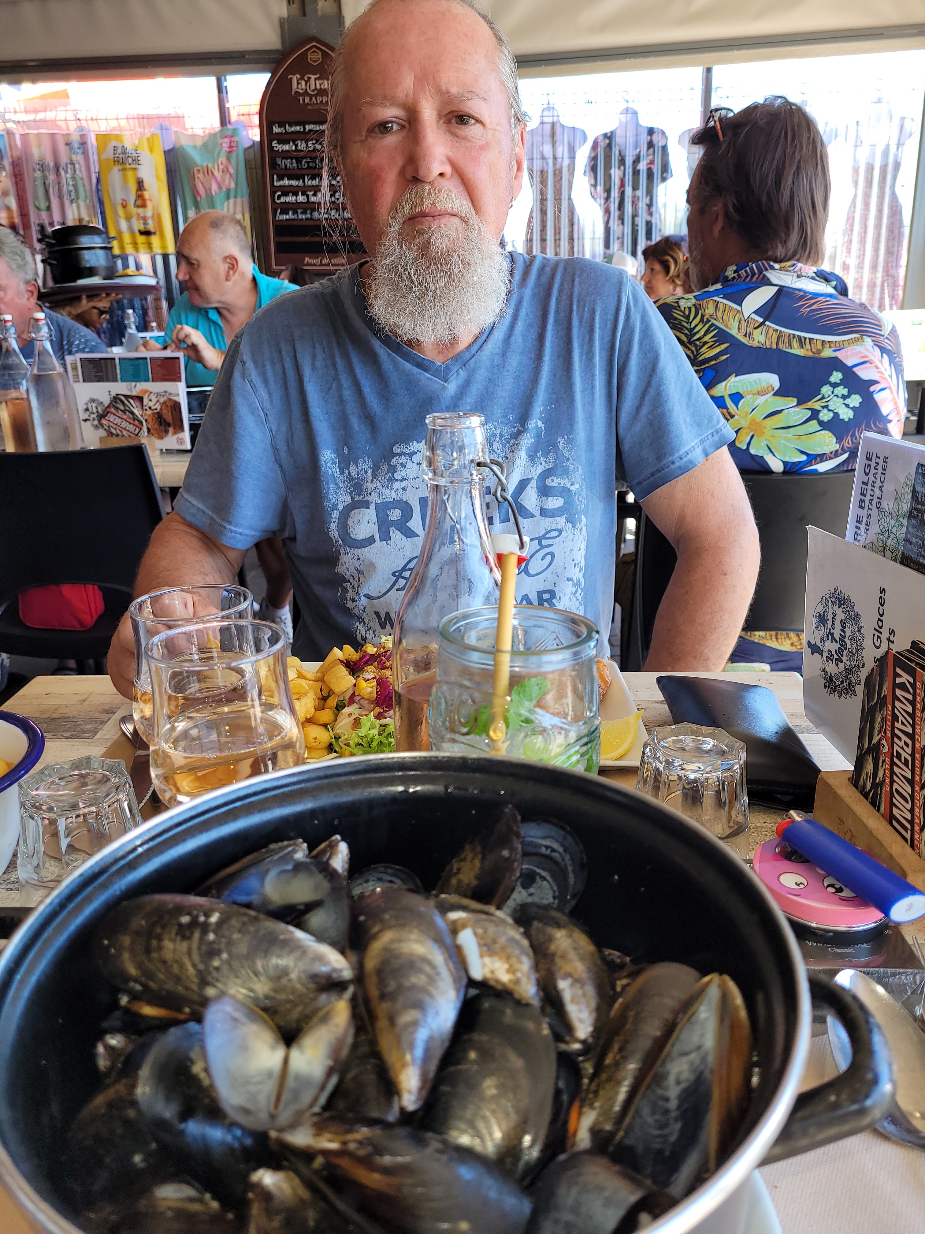 Cave à bières belge fabuleuse, moules crème d'ail géniales, serveurs plein d'humour. Une sorte de cantine du soir pour nous.