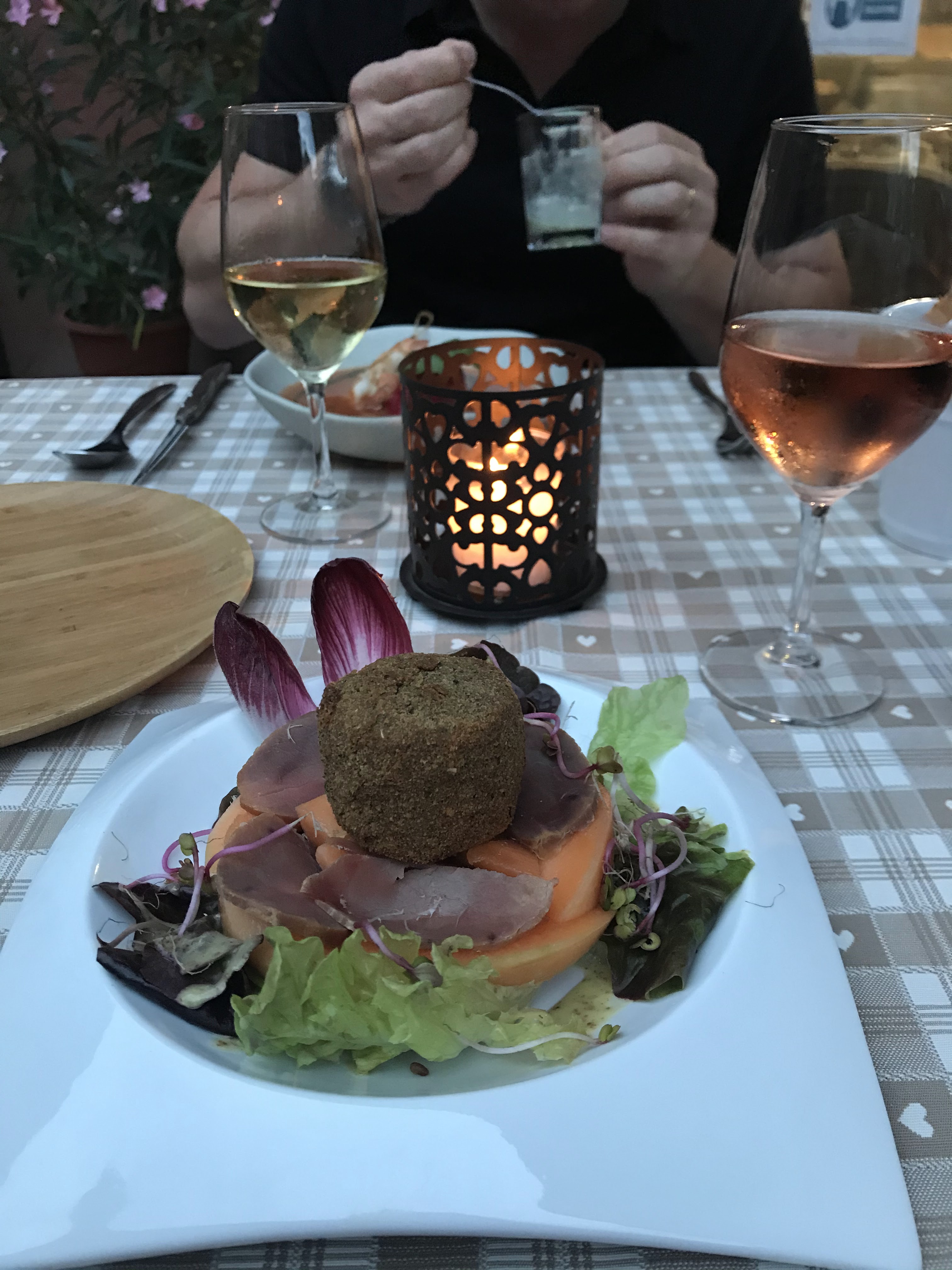 La Bachhante est une expérience amusante. Il est situé à Saint-Hippolyte, qui le soir est largement désert. Cela ne ressemble absolument pas à un restaurant traditionnel, bien au contraire, les plats sont servis dans un garage ouvert en face de la maison d'hôtes La Bachhante, où vous pourrez également bénéficier d'une nuitée pour toute la famille pour un prix très raisonnable. Nous avons opté pour leur menu à 3 plats, tous bien préparés et savoureux. Recommandable. Pour la nourriture, vous pouvez choisir parmi une gamme de vins produits localement dans la carte des vins, tous délicieux. Je pense que c'est l'homme de maison qui est en cuisine (et il le fait bien) et la dame qui sert (ce qu'elle fait aussi bien). Il est recommandé de réserver une table. Il n'y a pas beaucoup de places et quand nous y étions un mercredi, c'était salle comble.