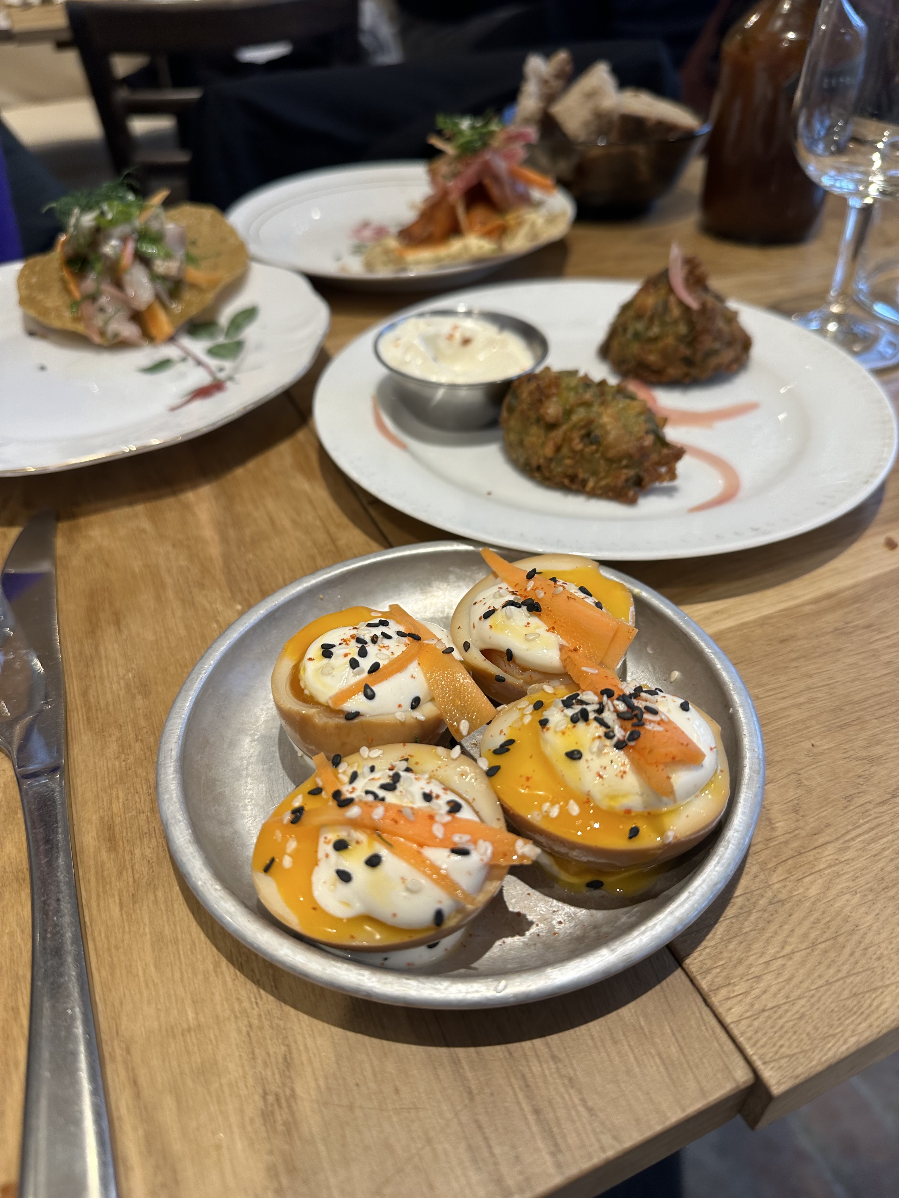 Ouverture récente, 1 mois environ, manque un peu de rodage en salle et en cuisine, resto full en semaine, donc les plats ont mis du temps à sortir mais le patron nous a offert des cocktails pour s’excuser. Les assiettes se partagent, les gouts et saveurs sont subtiles. Un bon.